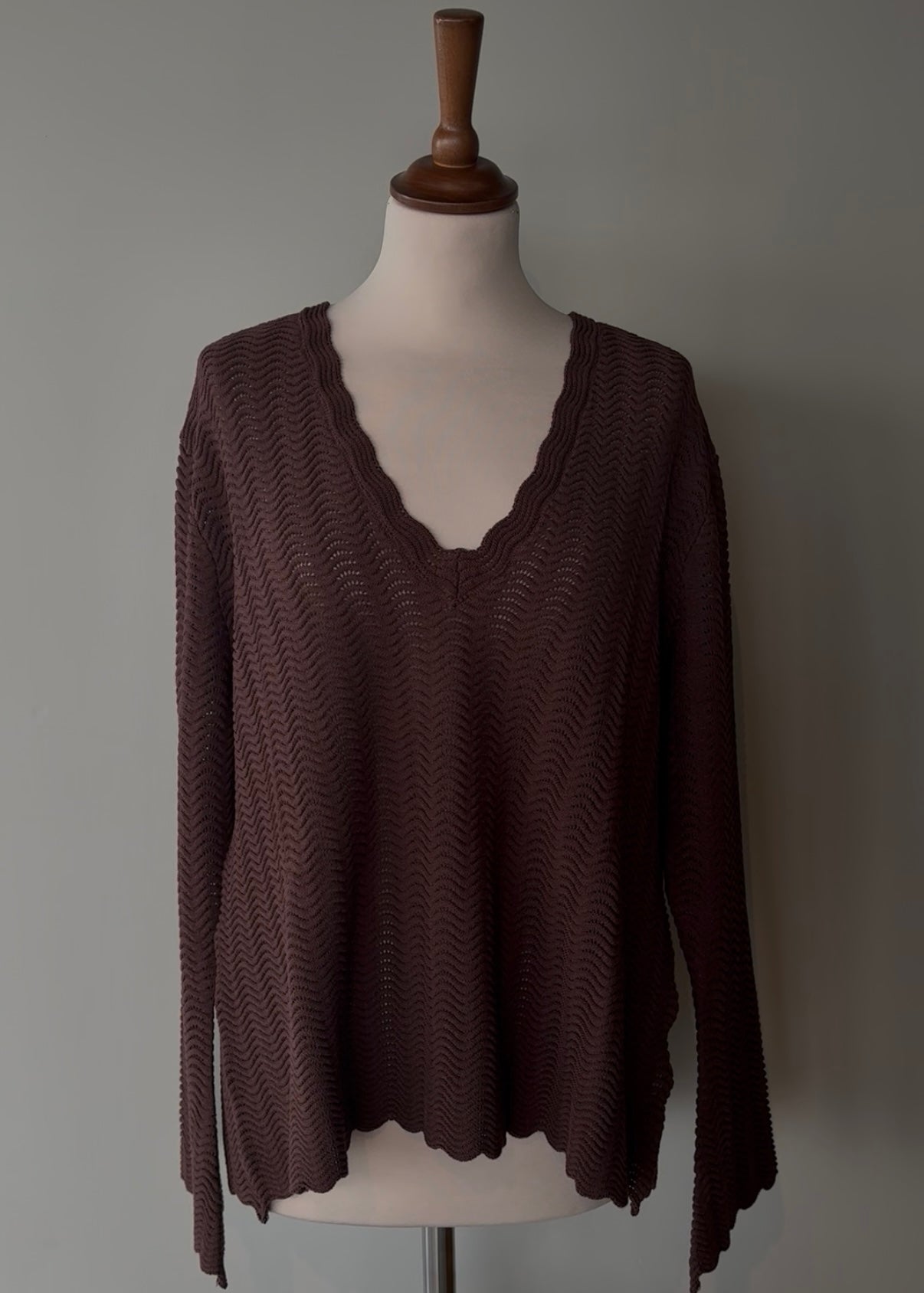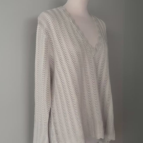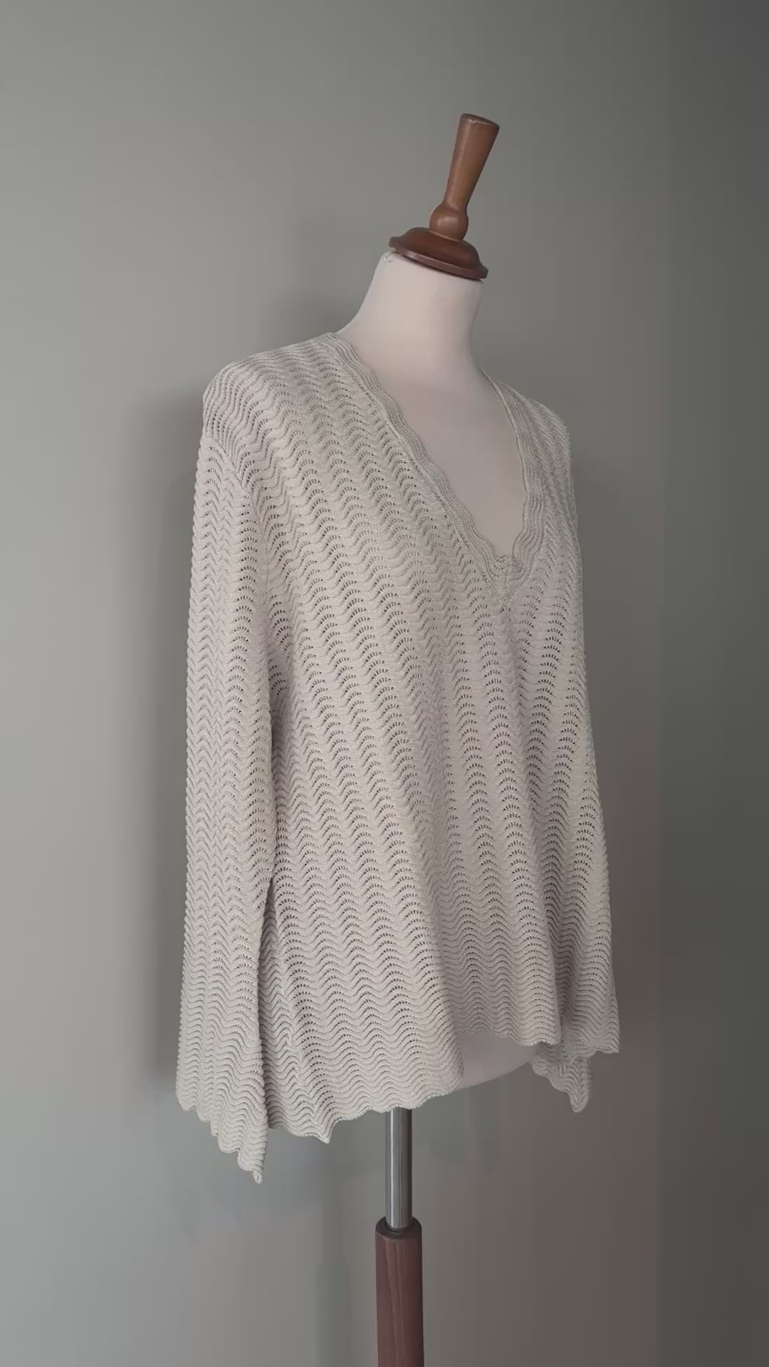 The garment is designed with the goal of fitting many sizes so it is wide in circumference. The pattern and yarn give it the lightness to adapt beautifully to many sizes. Size 2 is slightly later than size 1.
