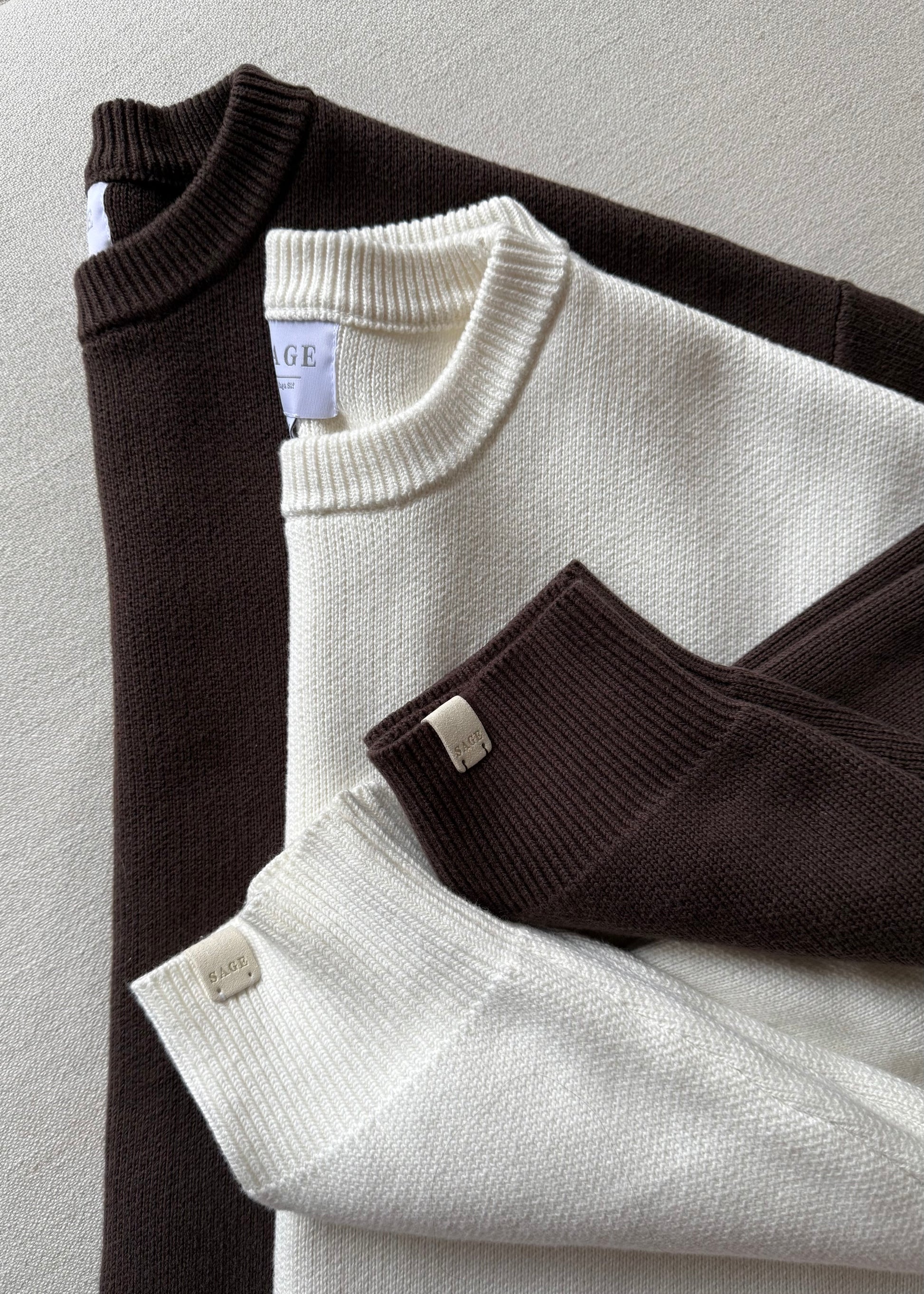 Þyrni er oversized crewneck peysa sem er ætluð fyrir öll kyn. Hún er prjónuð úr 100% bómull og er einstaklega falleg. Peysan kemur í tveimur litum dökkbrúnum og hvítu.