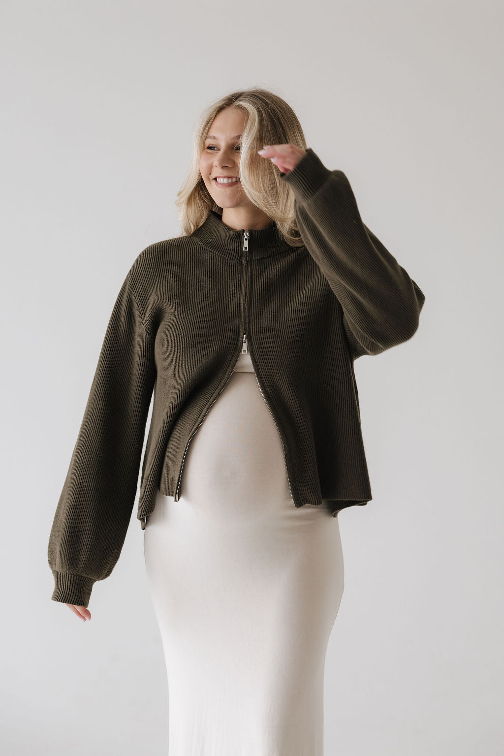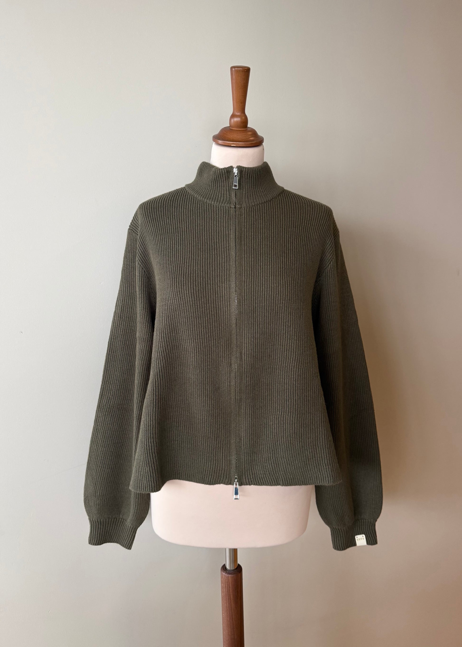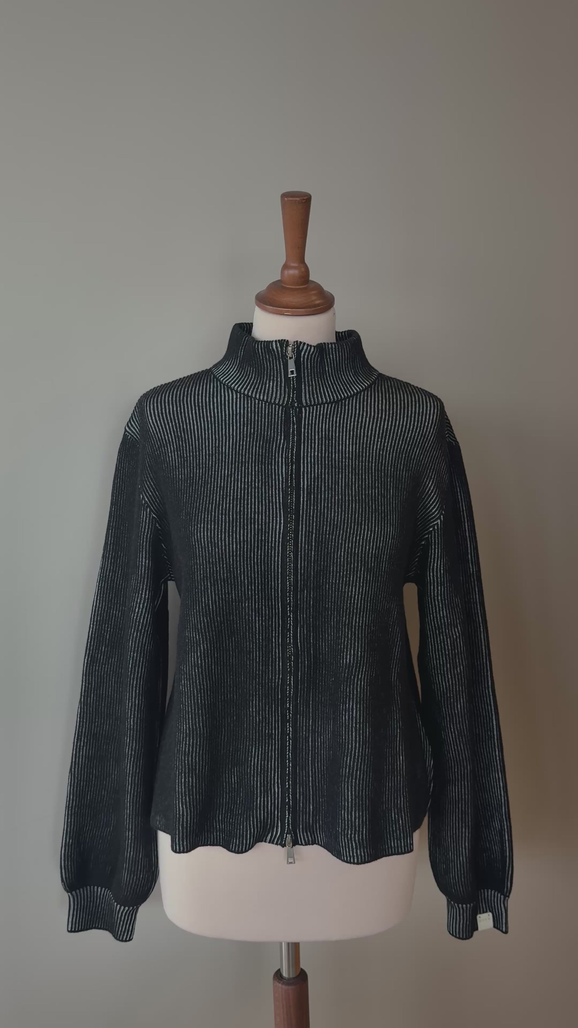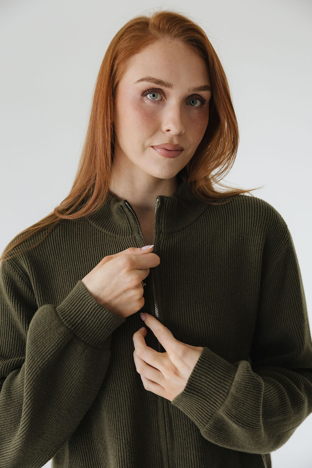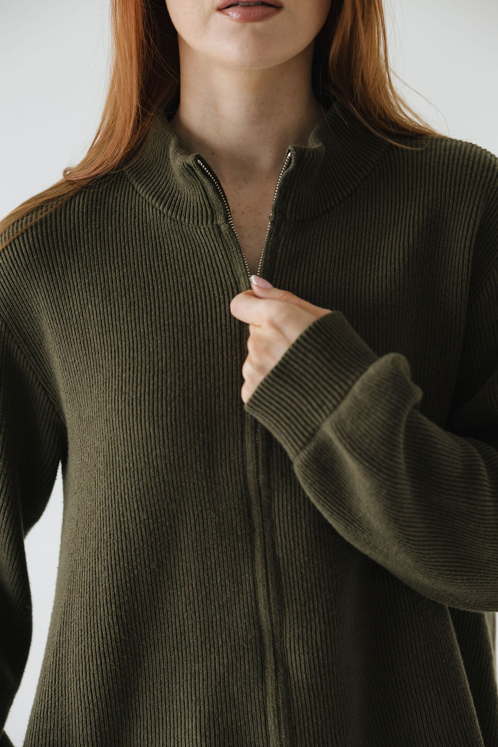 Myrkey er hin fullkomna oversized prjónapeysa sem hægt er að vera í á góðum notalegum stundum heimavið, í skólann og vinnuna. Peysan er rifflað prjónuð úr 80% bómull og 20% ull sem gerir hana létta og endingargóða, hún er með tvöföldum rennilás og kraga sem sem nær uppfyrir háls.