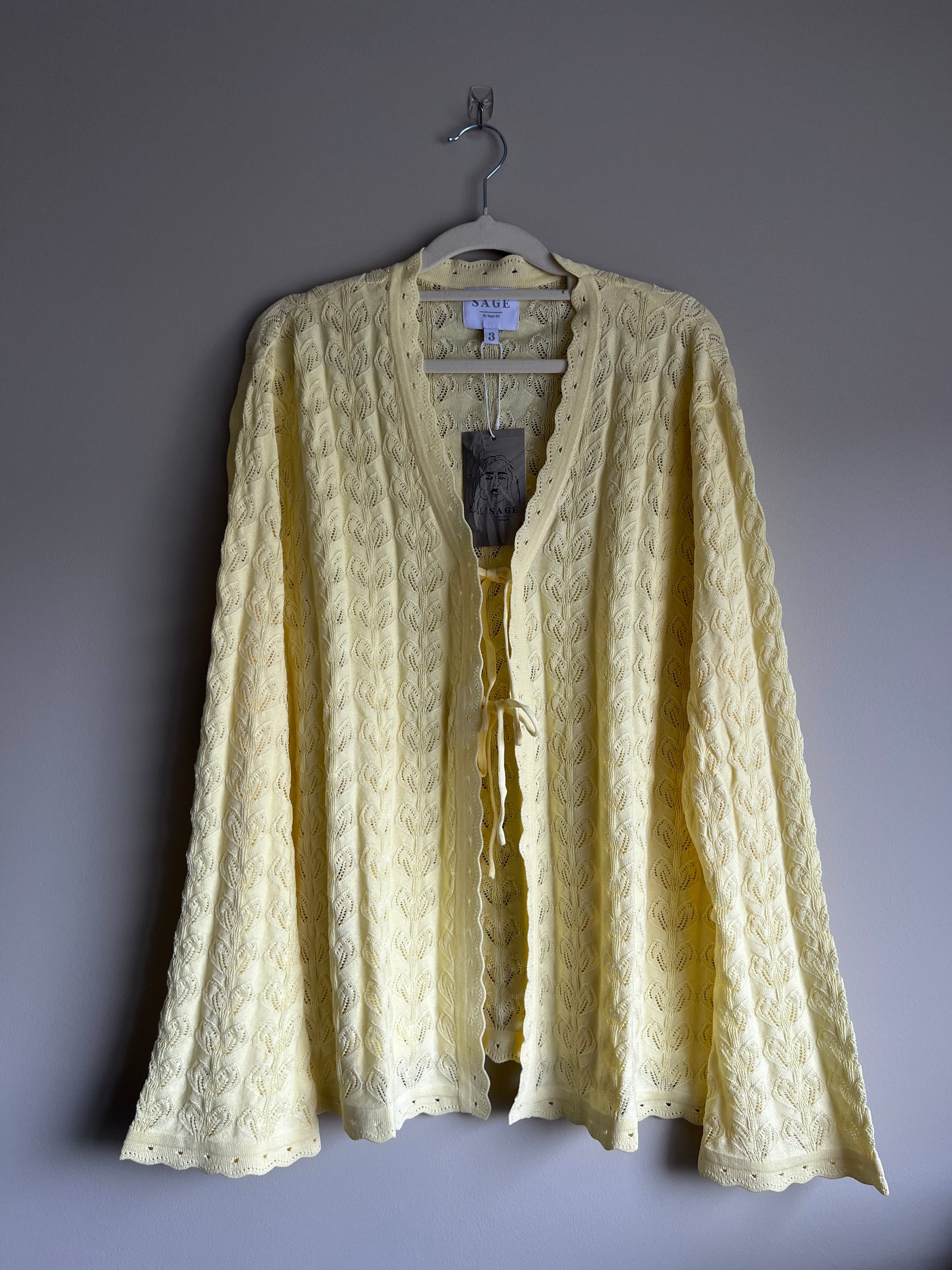 Rós er ótrúlega falleg, klæðileg peysa sem er bundin saman að framan með tveimur slaufum. Rós er prjónuð úr fallegu blómamynstri og á öllum endum er blúnda sem gerir flíkina einstaka. Peysan kemur í þessum fullkomna brúna og blá lit.
