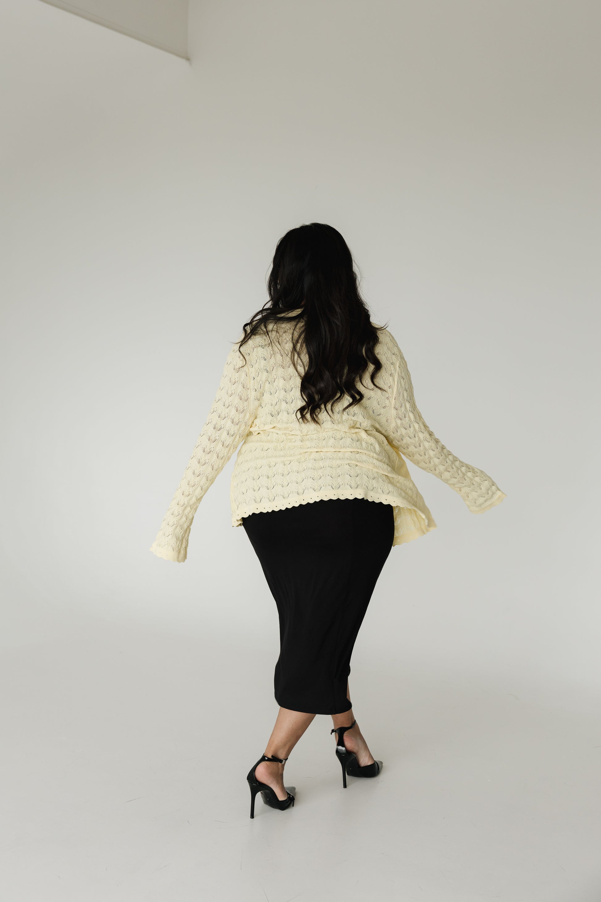 The garment is designed with the goal of fitting many sizes so it is wide in circumference. The pattern and yarn give it the lightness to adapt beautifully to many sizes. Size 2 is slightly later than size 1.