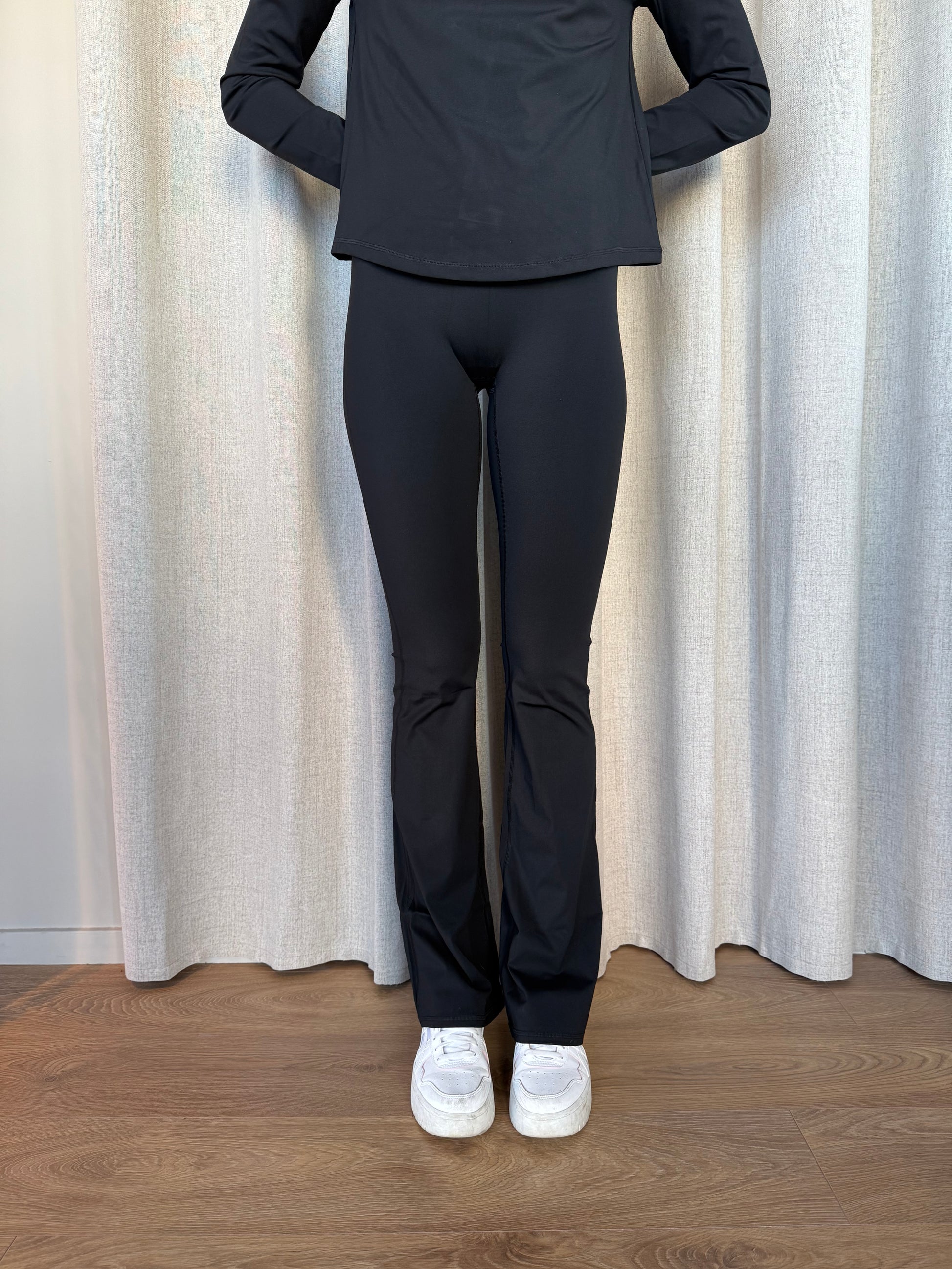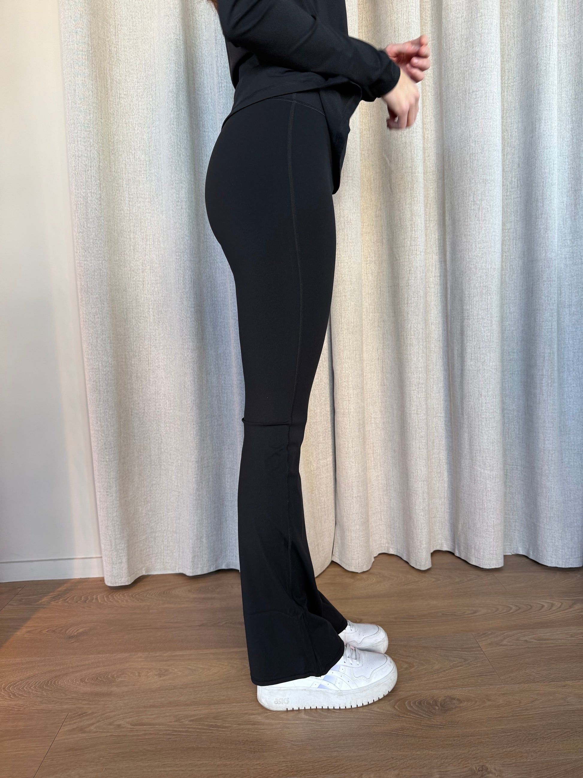 Buxurnar eru þröngar að ofan, útvíðar og saumlausar að farman og strengur heldur vel að yfir maga. Þessar eru 10cm síðari en regular buxurnar hjá okkur.