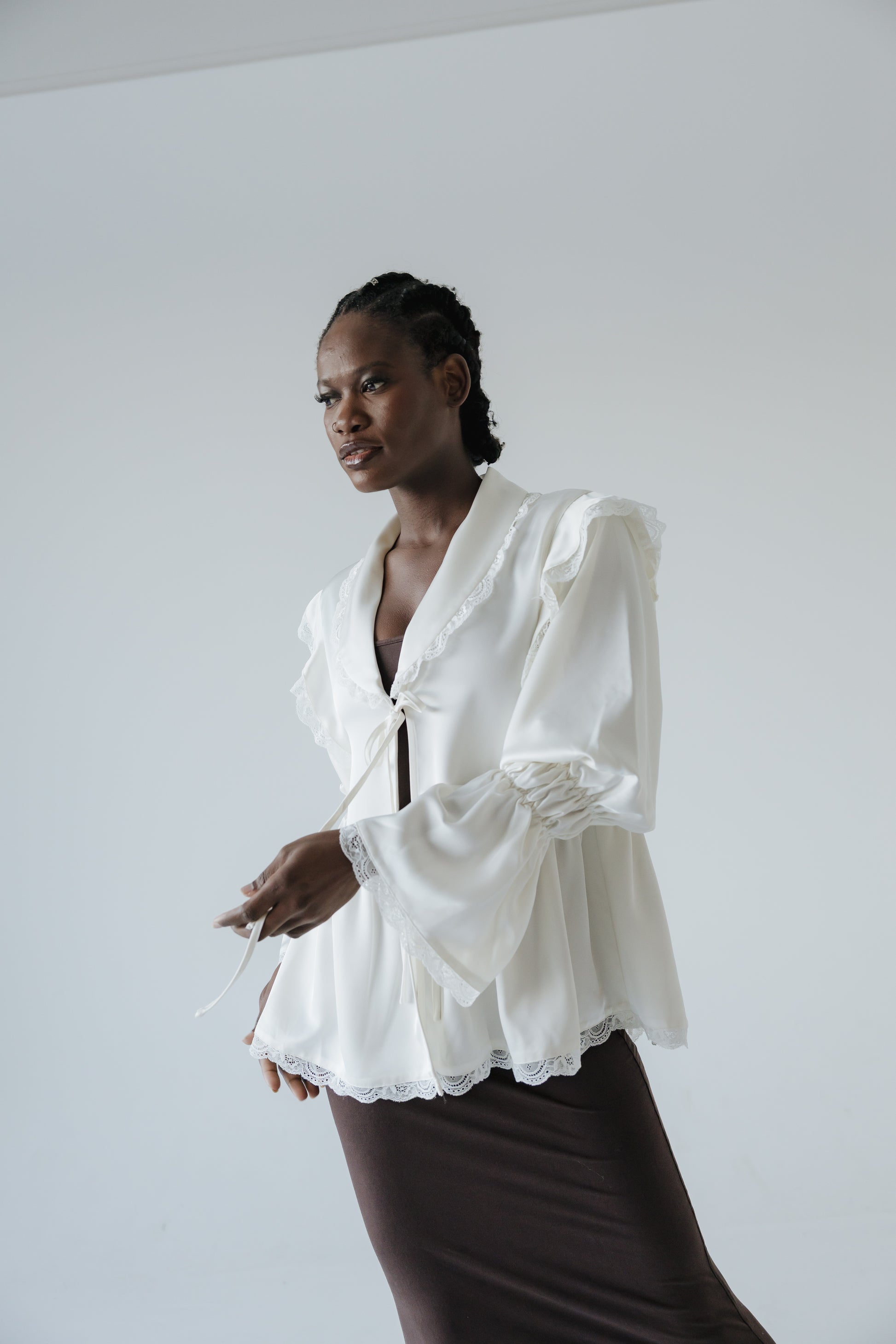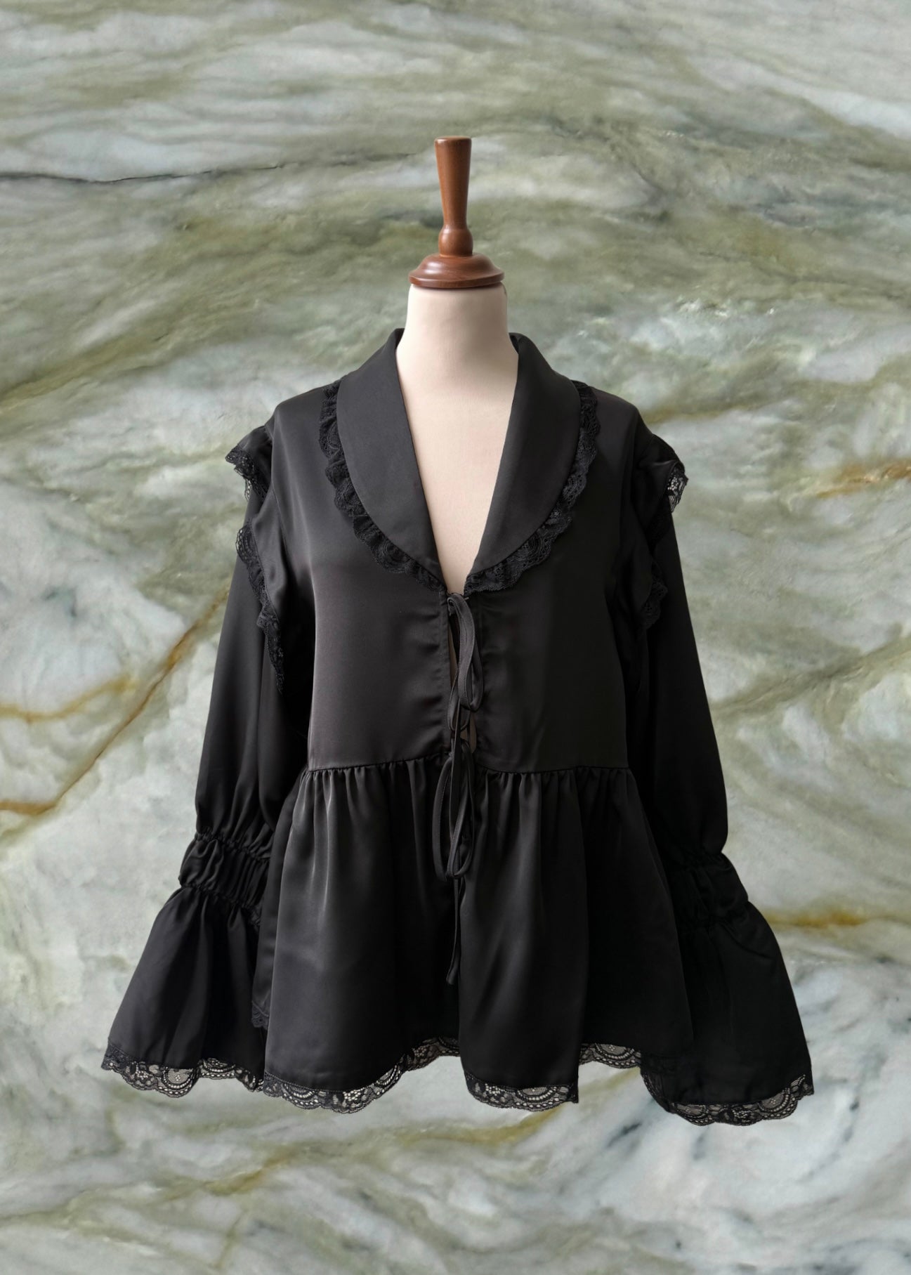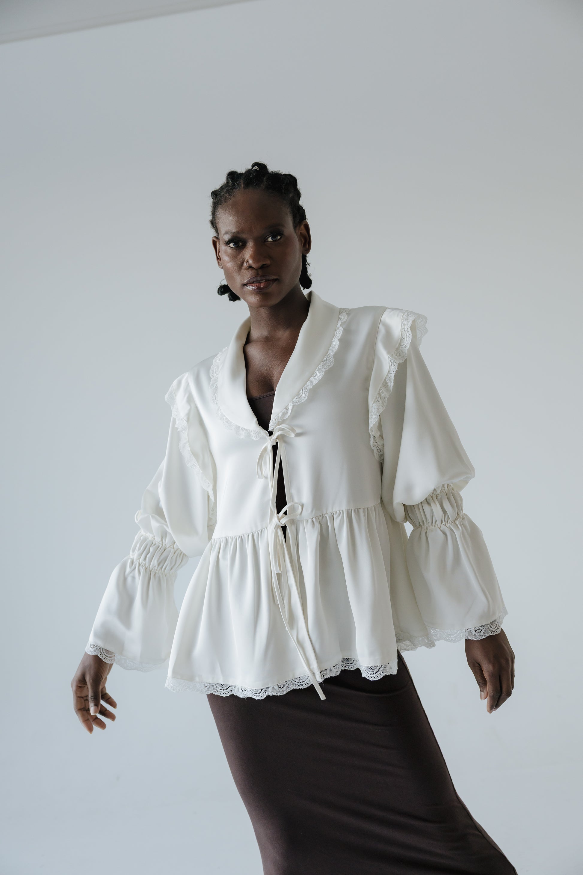 Klæðileg blússa sem er bundin saman að framan með tveimur slaufum. Á öllum endum, öxlum og á kraga er falleg vönduð blúnda sem gerir flíkina einstaka. Ermarnar eru útvíðar en dregnar saman með tveimur teygjum aðeins fyrir ofan úlnlið. Hera er hin fullkoman blússa fyrir öll hátíðartilefni.