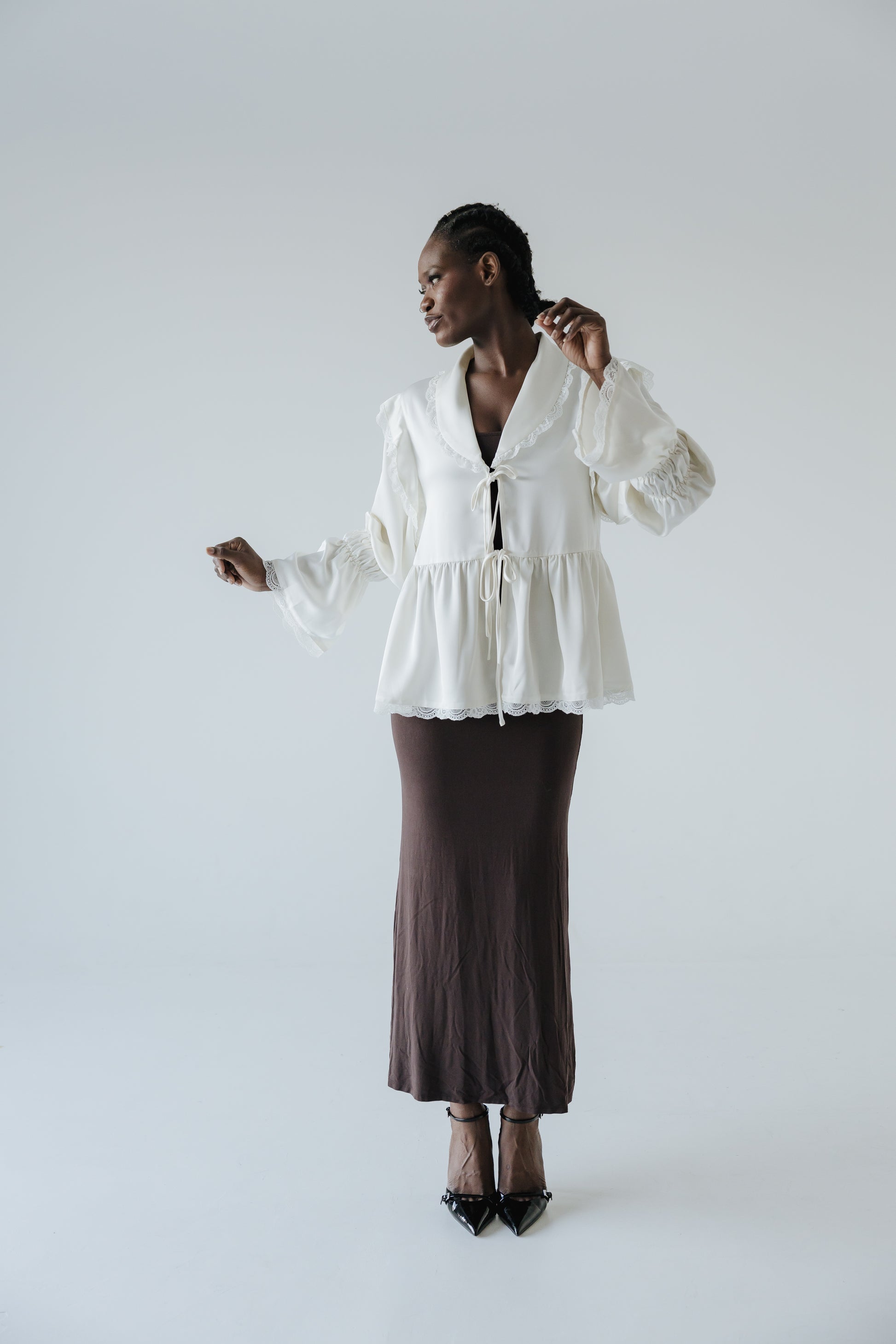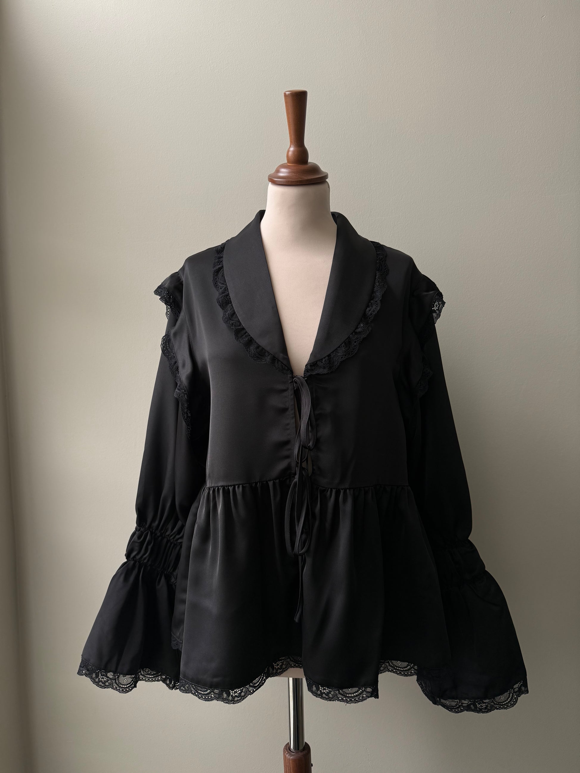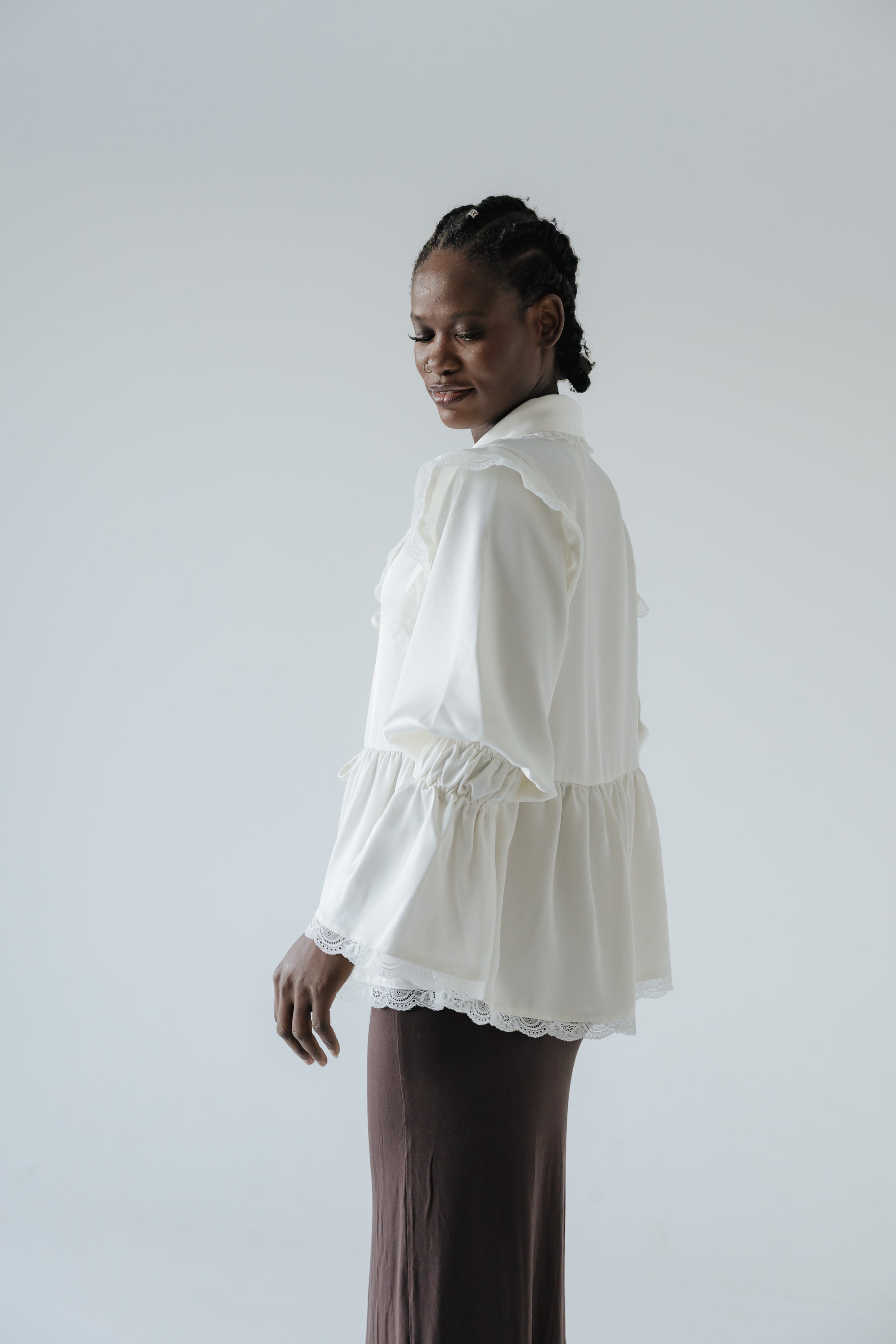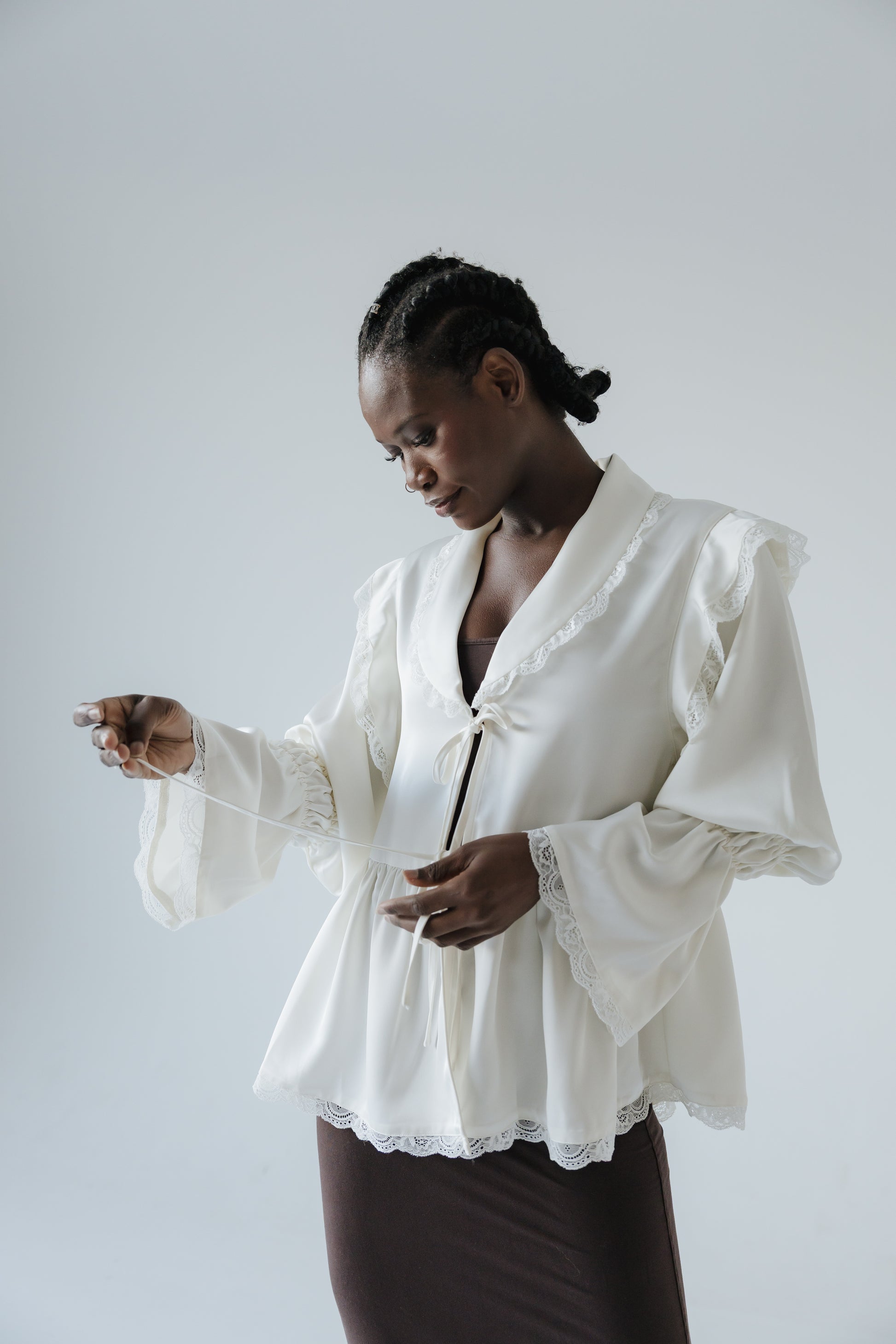 Klæðileg blússa sem er bundin saman að framan með tveimur slaufum. Á öllum endum, öxlum og á kraga er falleg vönduð blúnda sem gerir flíkina einstaka. Ermarnar eru útvíðar en dregnar saman með tveimur teygjum aðeins fyrir ofan úlnlið. Hera er hin fullkoman blússa fyrir öll hátíðartilefni.