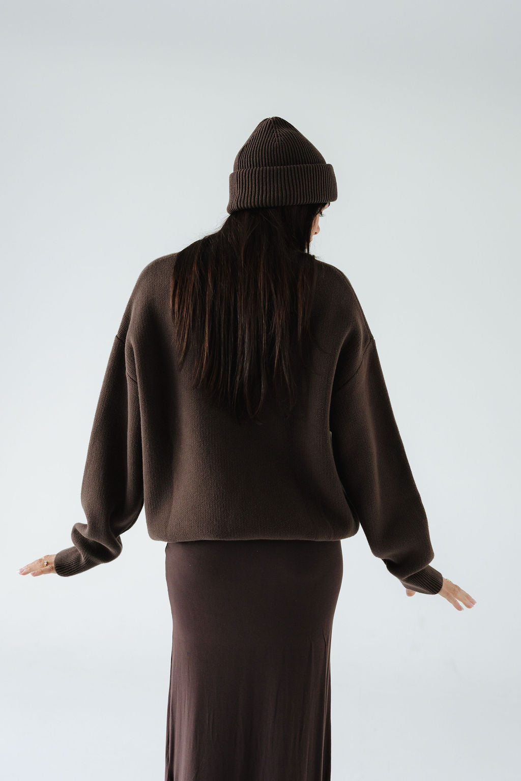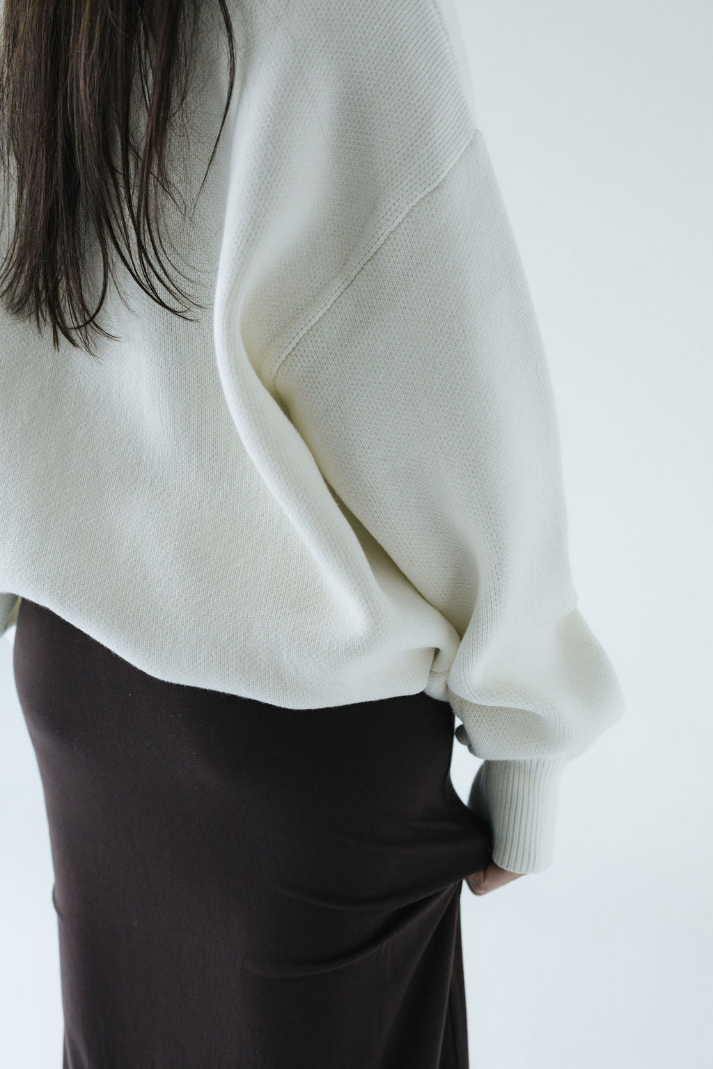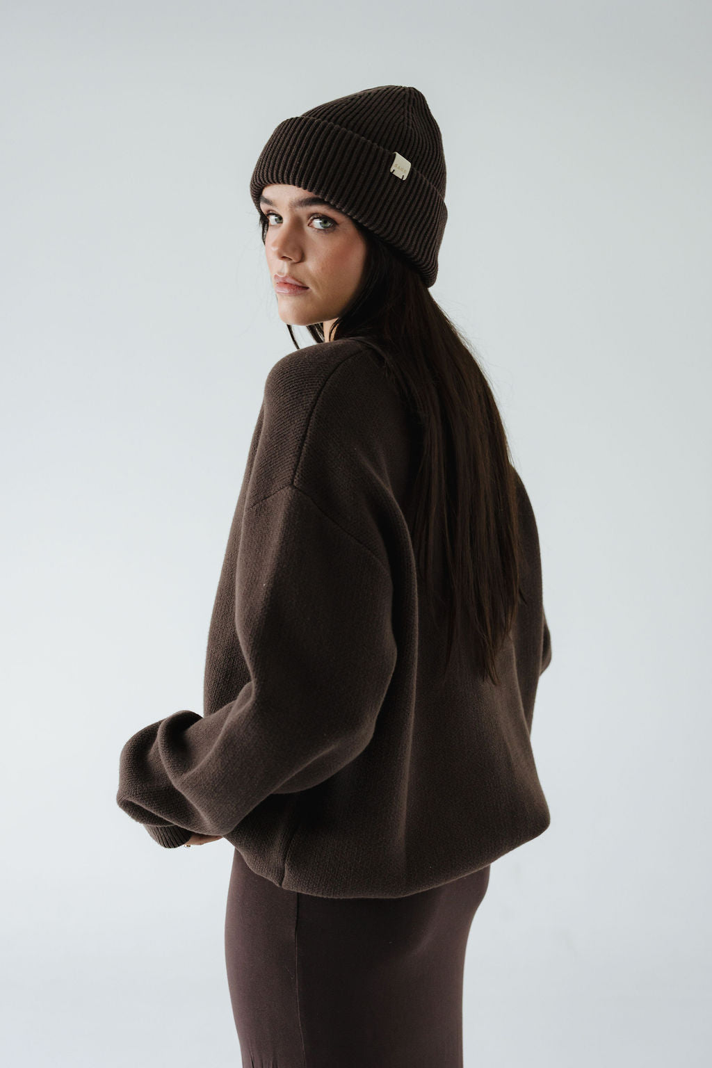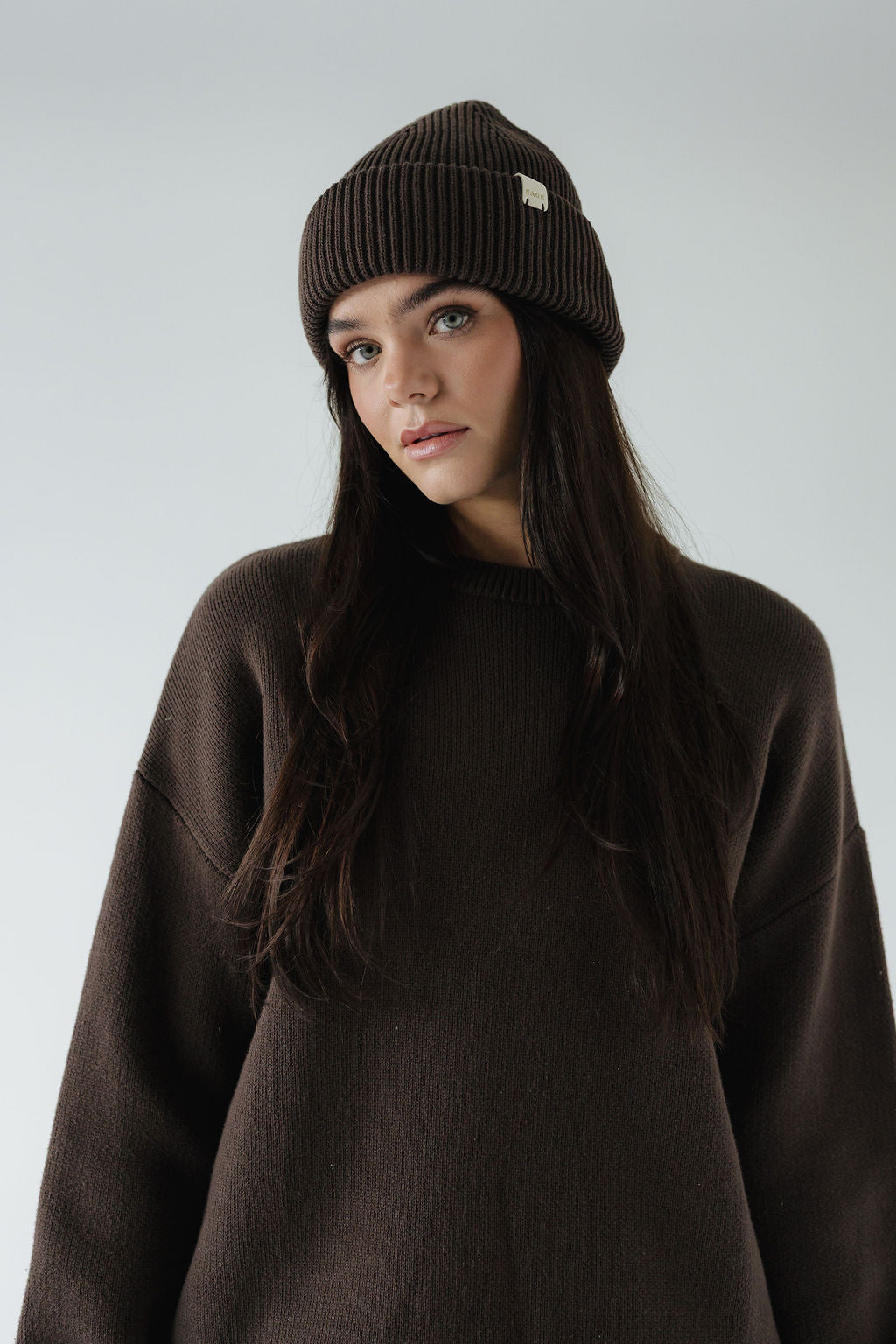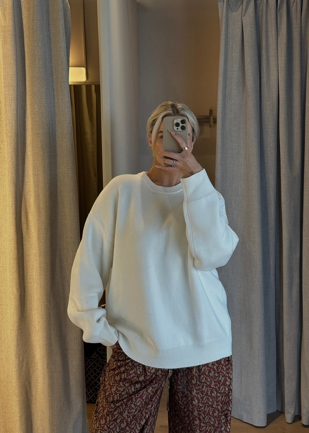 Þyrni er oversized crewneck peysa sem er ætluð fyrir öll kyn. Hún er prjónuð úr 100% bómull og er einstaklega falleg. Peysan kemur í tveimur litum dökkbrúnum og hvítu.