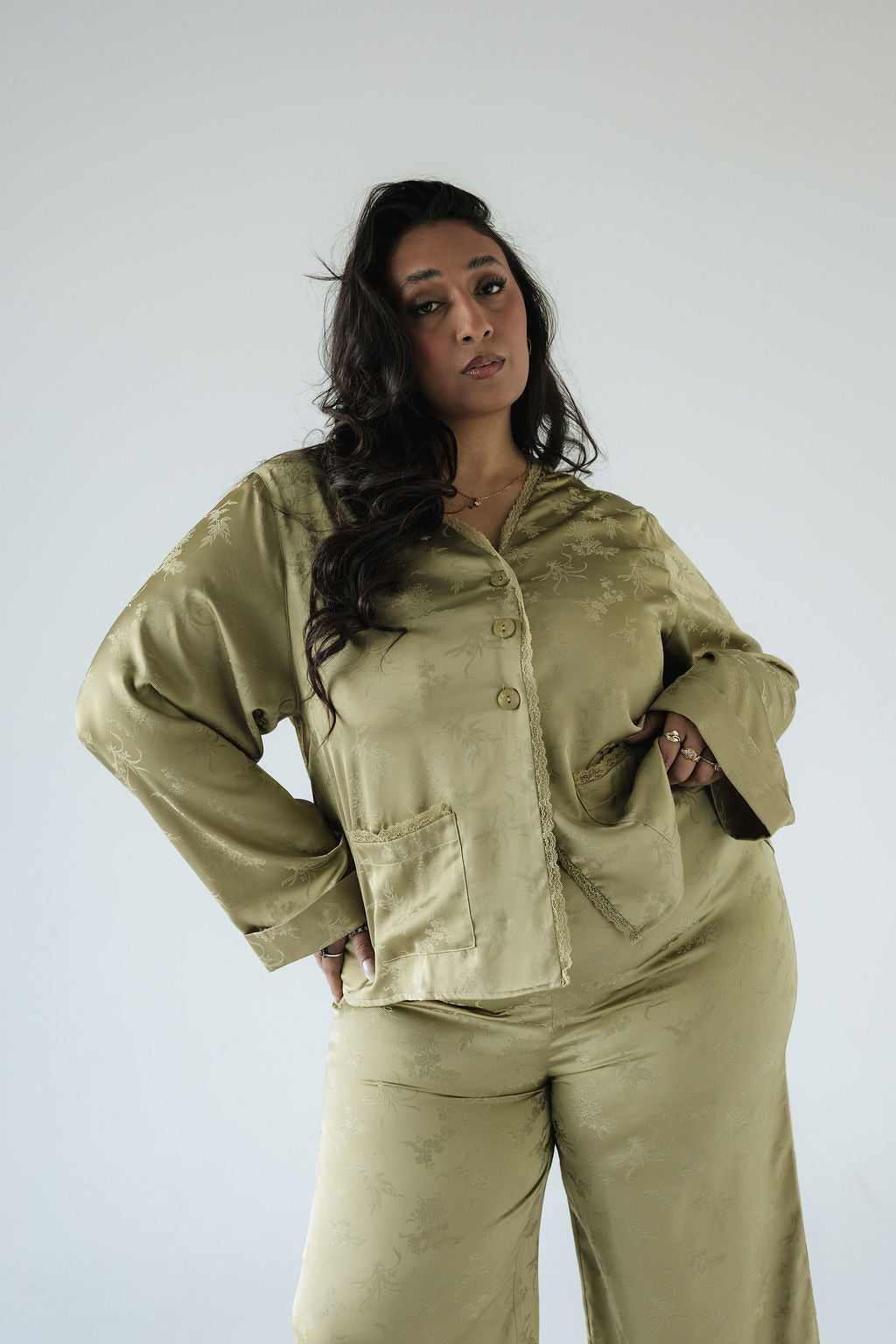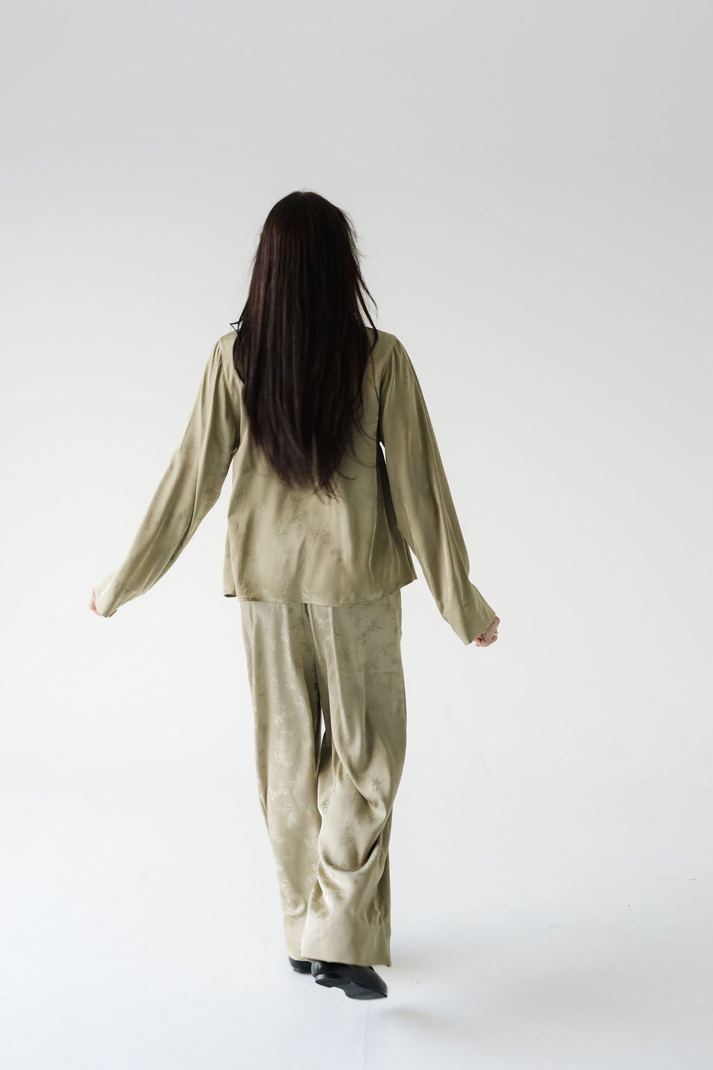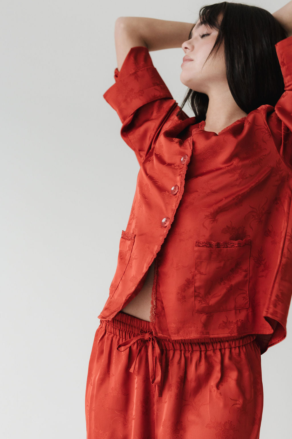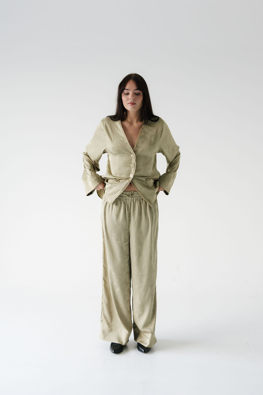 Lúna er saman sett af blússu og buxum, sniðið er vítt og hannað með þægindi efst í huga. Blússan er með fallegri blúndu á hálsmáli og á vösum. Buxurnar eru víðar í sniðinu og dregnar inn með teygju og bandi í strengnum. Settið hefur þann eiginleika að neðan á bæði ermum og buxunum er efnið uppábrett og þar er lítill saumur sem hægt er að rekja upp, strauja og þá er hægt að lengja flíkina ef þess er þörf. Settið kemur í þremur litum, rauðbrúnu, grænu og svörtu.