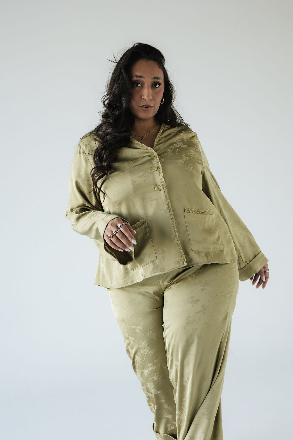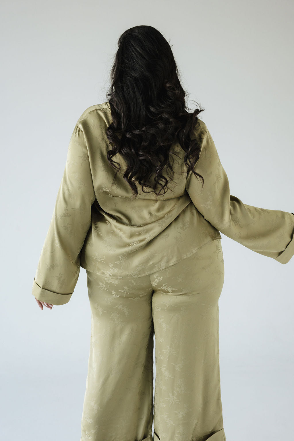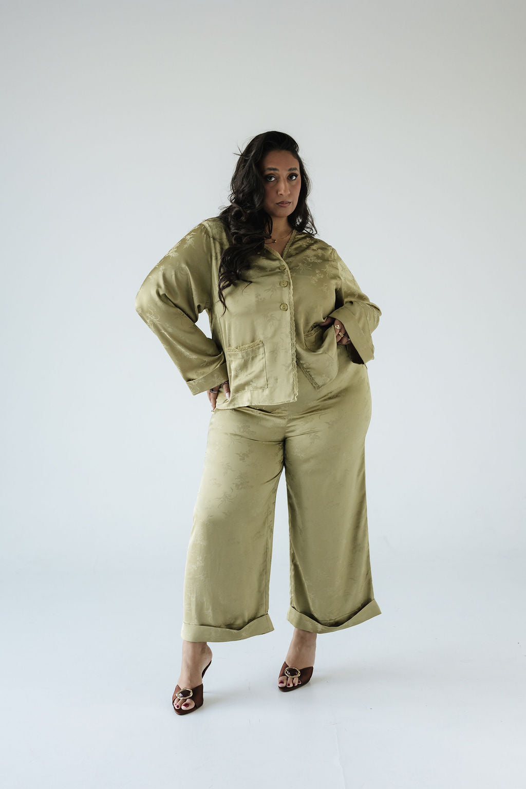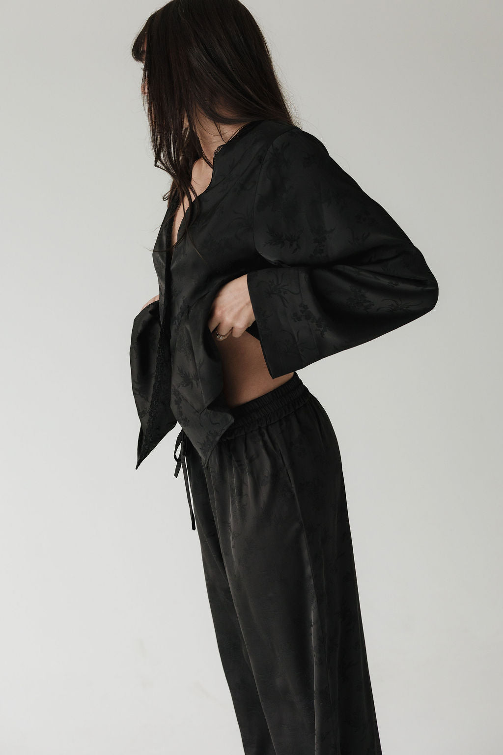 Lúna er saman sett af blússu og buxum, sniðið er vítt og hannað með þægindi efst í huga. Blússan er með fallegri blúndu á hálsmáli og á vösum. Buxurnar eru víðar í sniðinu og dregnar inn með teygju og bandi í strengnum. Settið hefur þann eiginleika að neðan á bæði ermum og buxunum er efnið uppábrett og þar er lítill saumur sem hægt er að rekja upp, strauja og þá er hægt að lengja flíkina ef þess er þörf. Settið kemur í þremur litum, rauðbrúnu, grænu og svörtu.