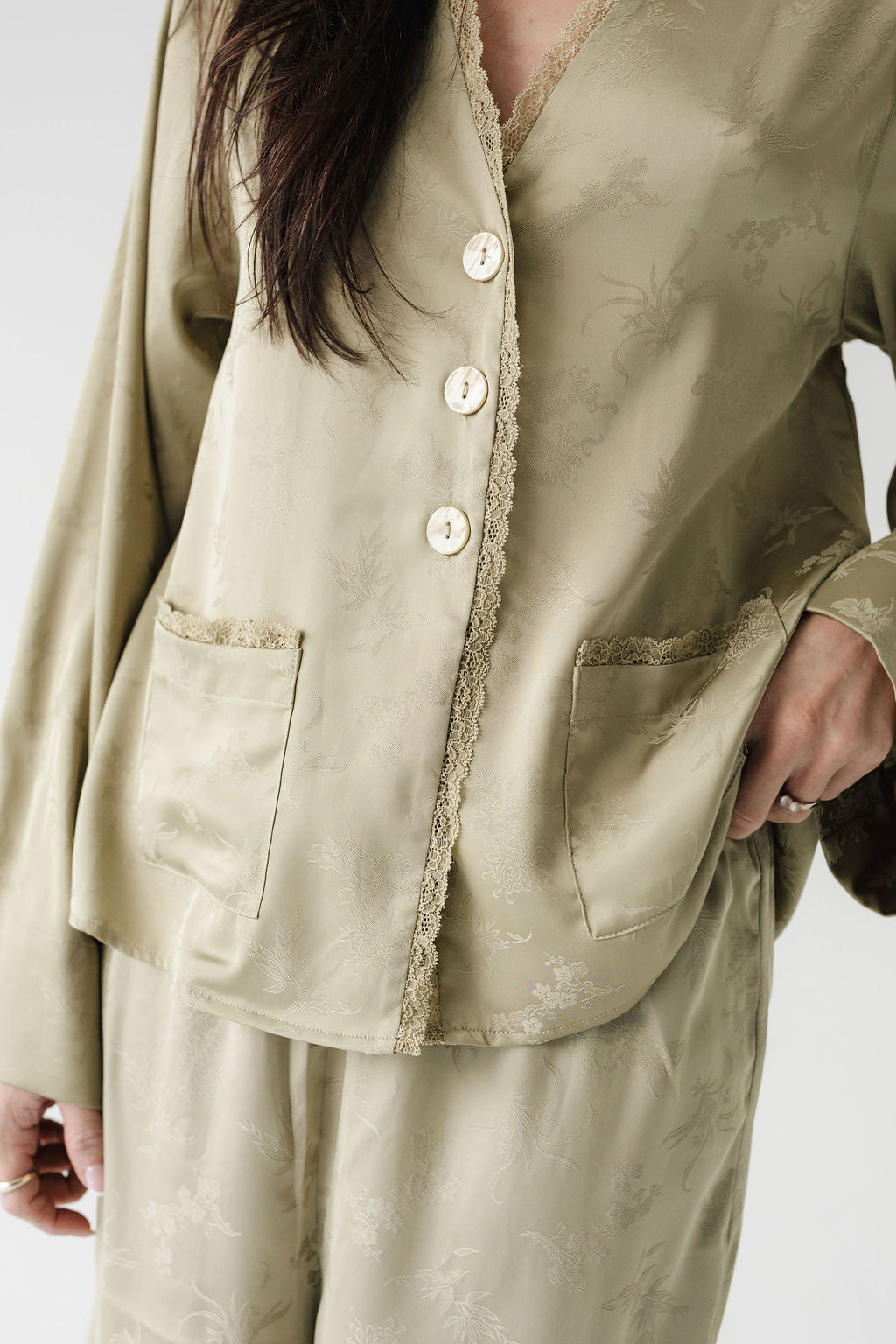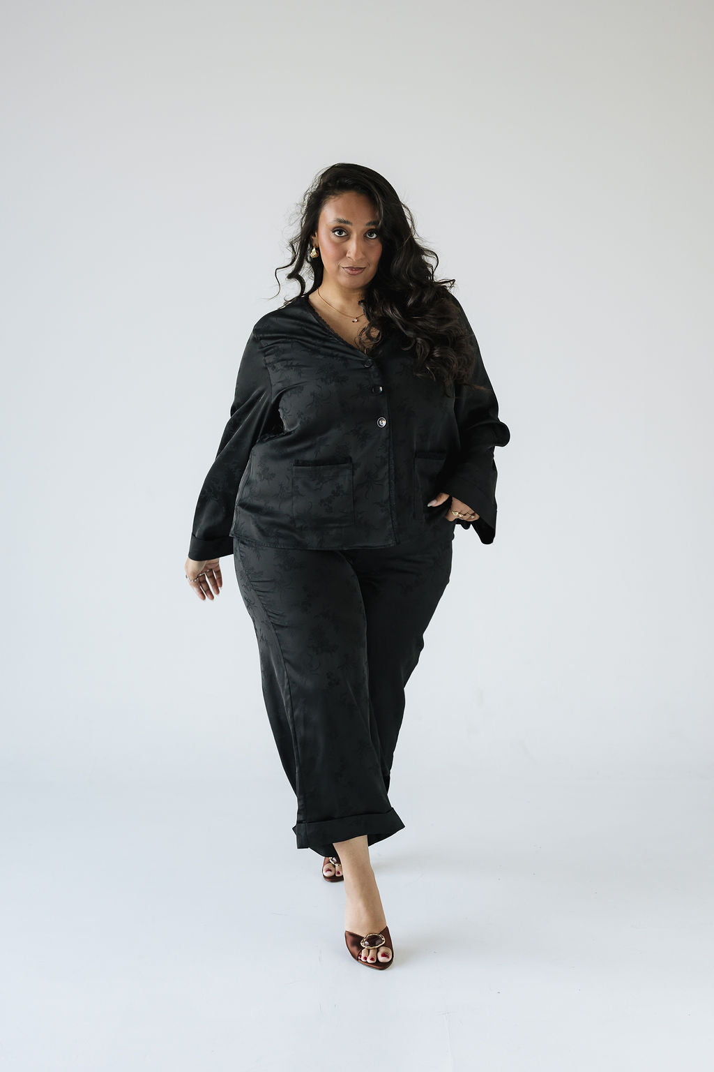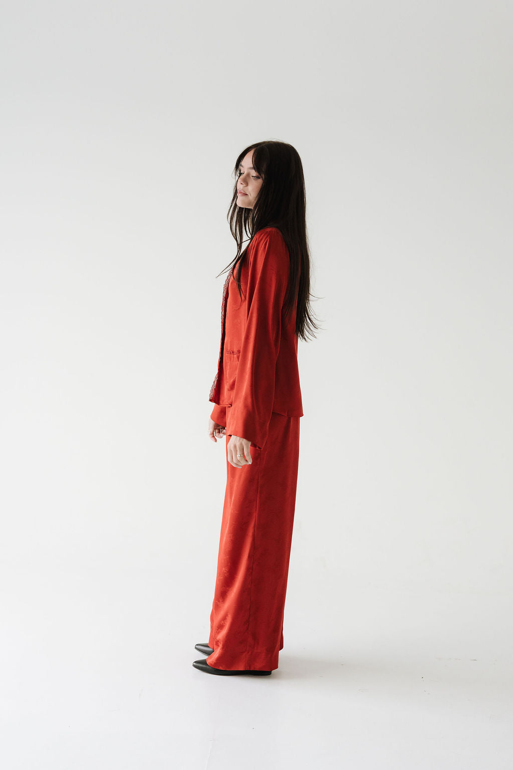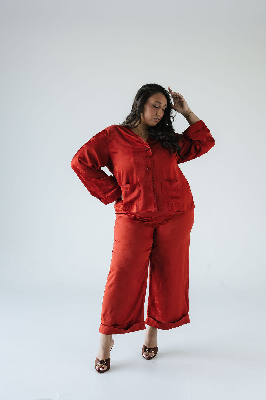 Lúna er saman sett af blússu og buxum, sniðið er vítt og hannað með þægindi efst í huga. Blússan er með fallegri blúndu á hálsmáli og á vösum. Buxurnar eru víðar í sniðinu og dregnar inn með teygju og bandi í strengnum. Settið hefur þann eiginleika að neðan á bæði ermum og buxunum er efnið uppábrett og þar er lítill saumur sem hægt er að rekja upp, strauja og þá er hægt að lengja flíkina ef þess er þörf. Settið kemur í þremur litum, rauðbrúnu, grænu og svörtu.