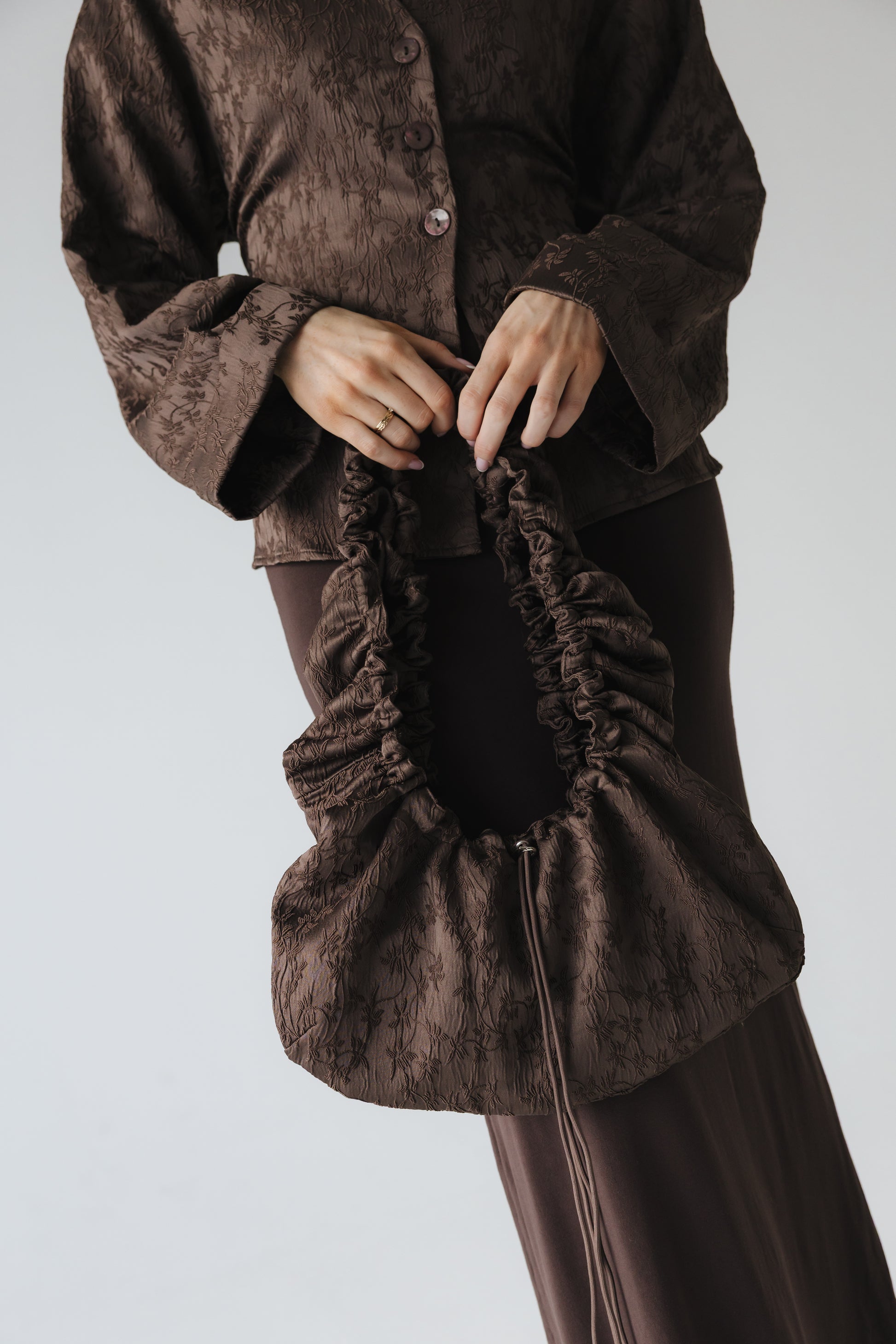 Ella taskan sameinar þægindi og stíl. Hver og einn getur auðveldlega stillt lengdina eftir eigin þörfum með böndum sitthvoru megin, hvort sem hún er borin á annarri öxlinni eða þvert yfir líkamann. Efnið er fallegt með blóma mynstri og er hún í sama sniði og May nema taskan sjálf er breiðari og bandið yfir öxlina er extra langt svo hún heldur fallegri rikkingu þegar hún er notum þvert yfir bringu. Taskan er hönnuð með renndum vasa fyrir smærri hluti að innan og segul smellu til að loka töskunni.