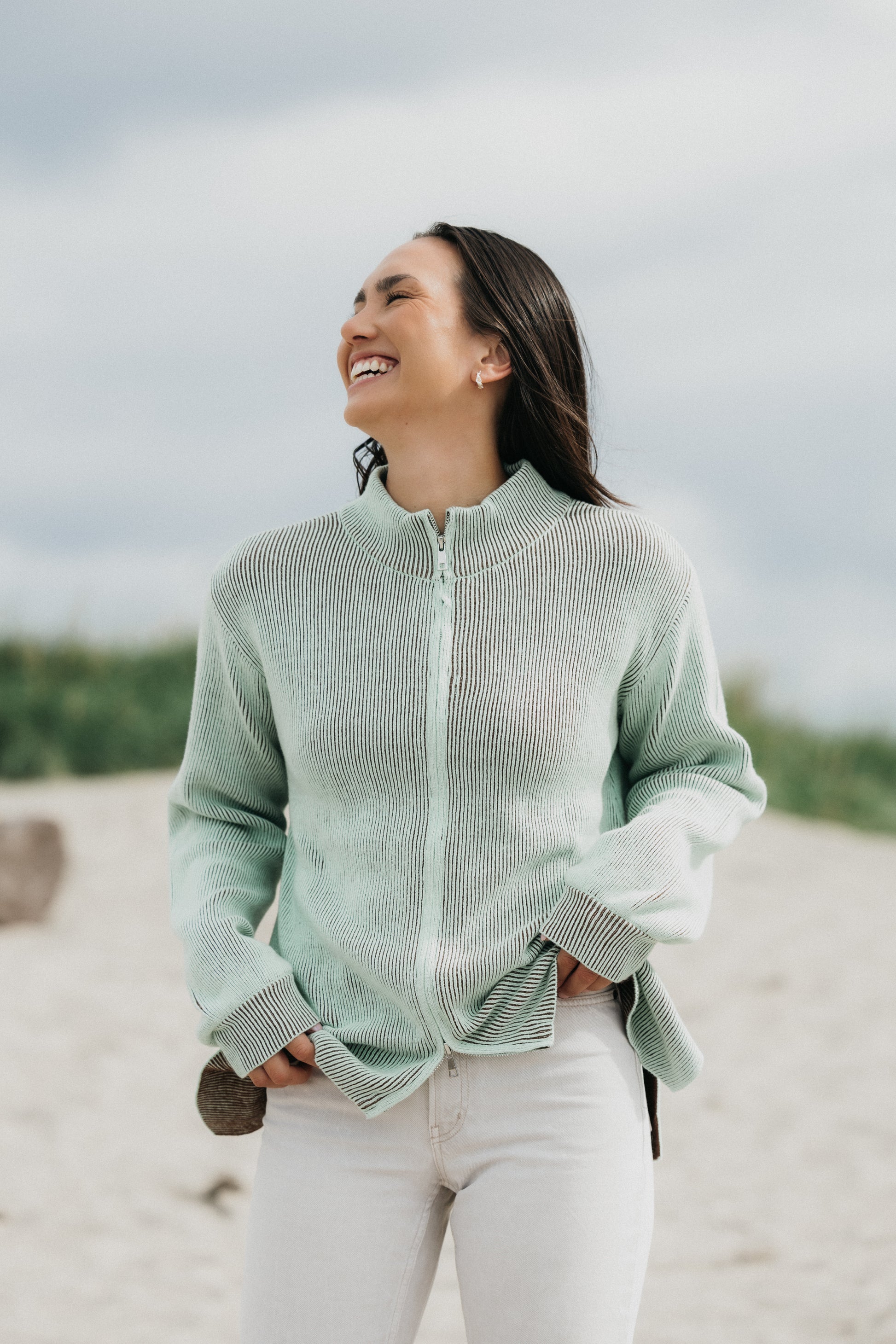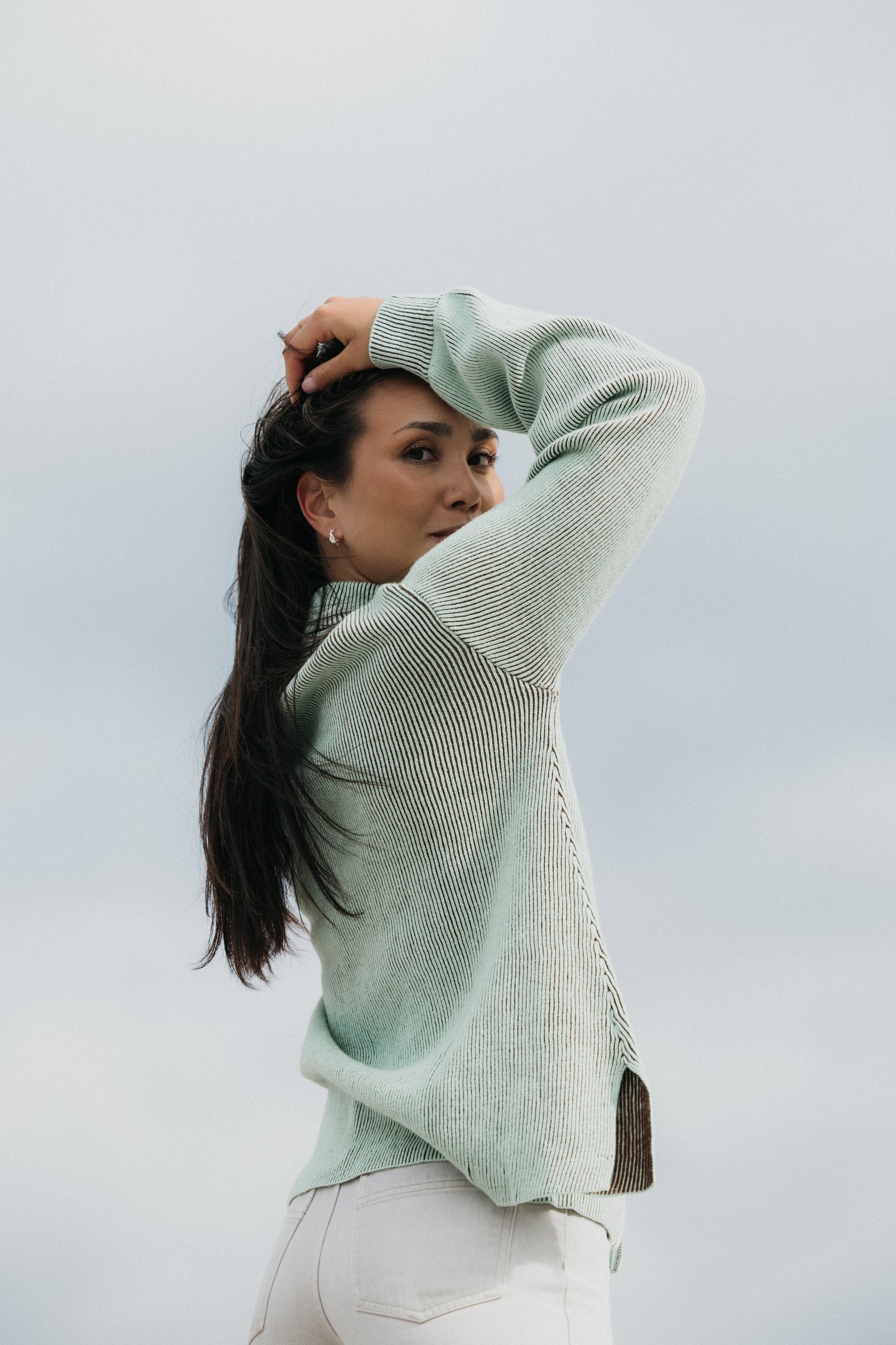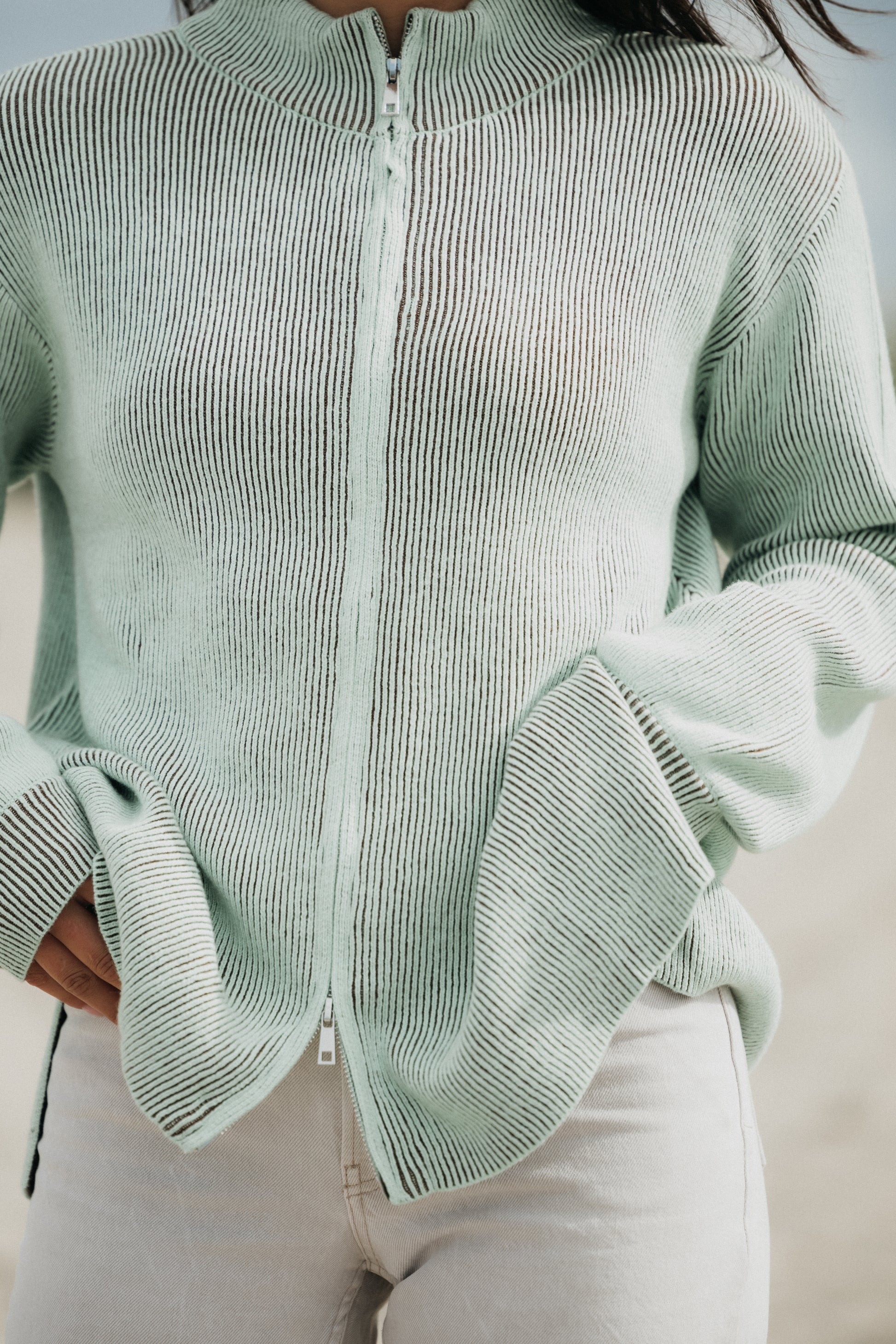 Myrkey er hin fullkomna oversized prjónapeysa sem hægt er að vera í á góðum notalegum stundum heimavið, í skólann og vinnuna. Peysan er rifflað prjónuð úr 80% bómull og 20% ull sem gerir hana létta og endingargóða, hún er með tvöföldum rennilás, 10cm klauf á hliðinni og kraga sem sem nær uppfyrir háls. Peysan er tvílituð sem gefur henni svo fallegt mynstur og áferð, hún er ætluð öllum kynjum og kemur í tveimur litum, ljósgrænu og ljósgráu.