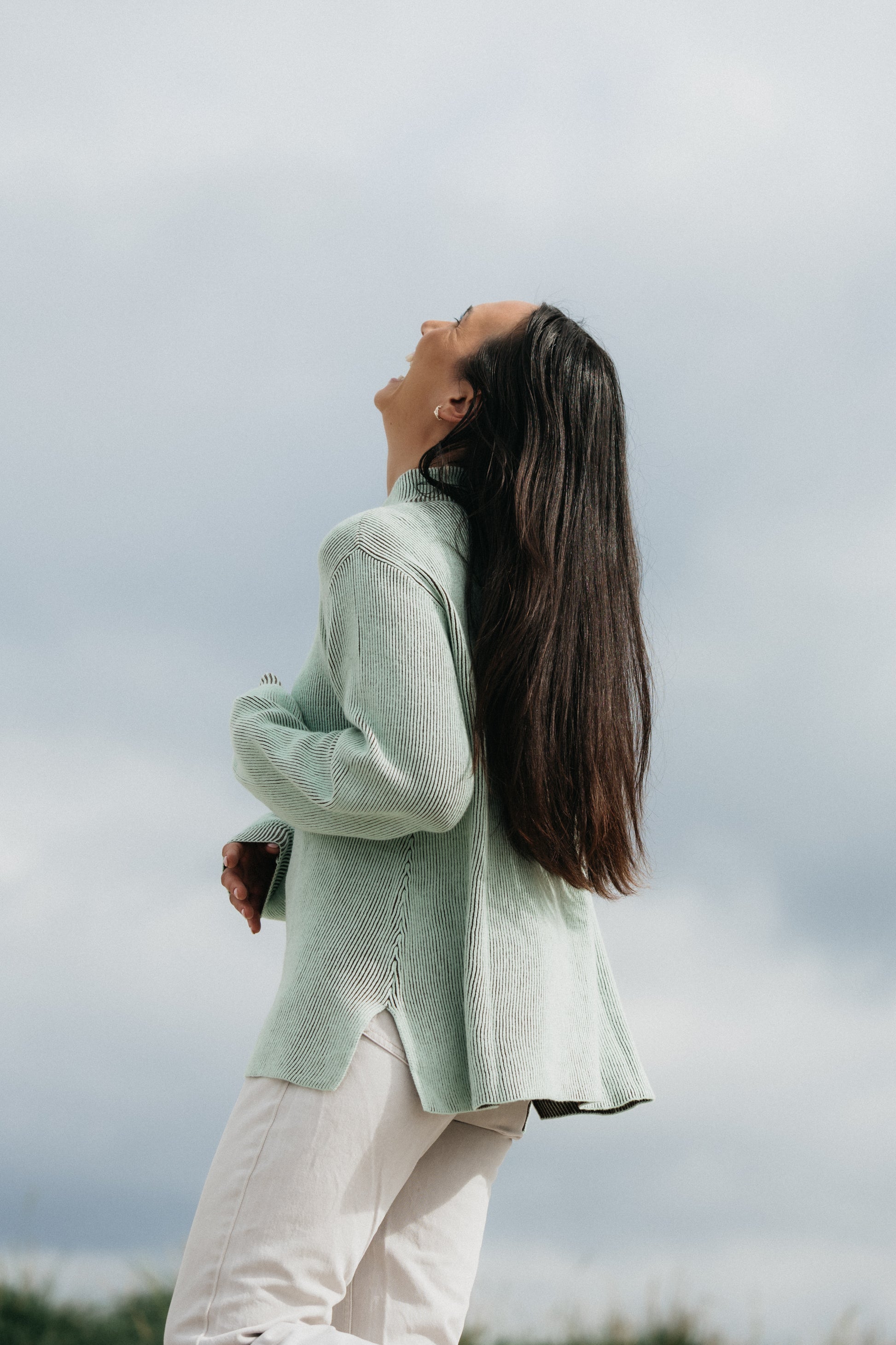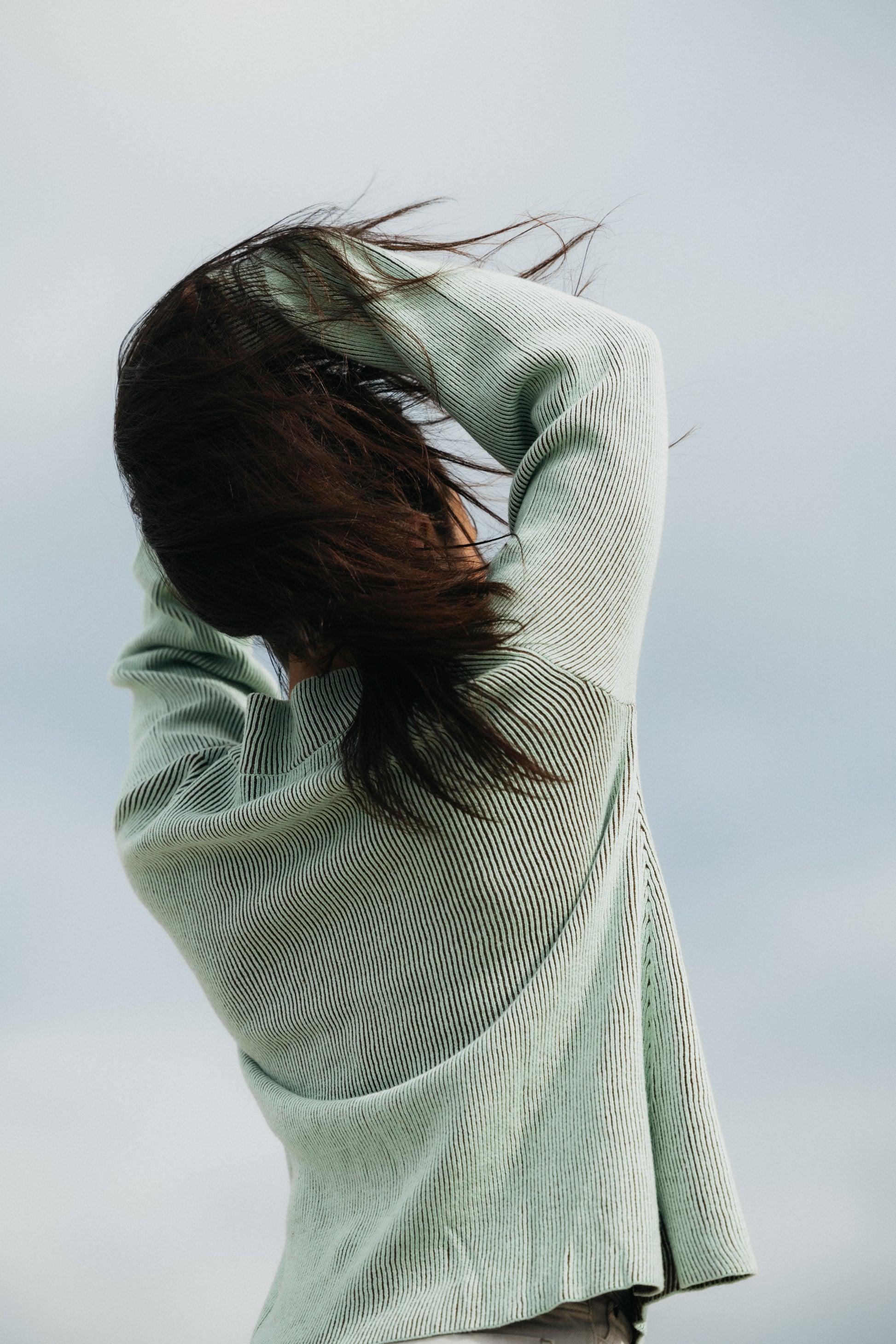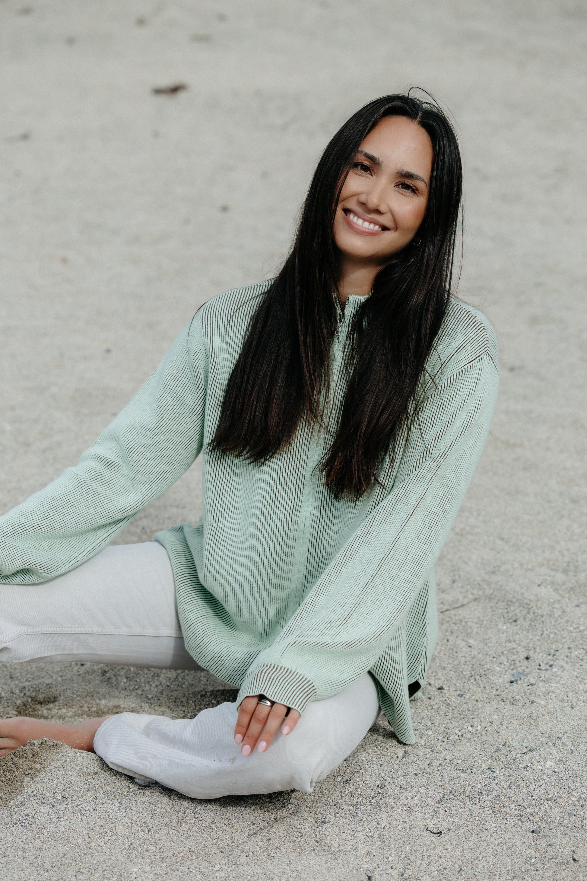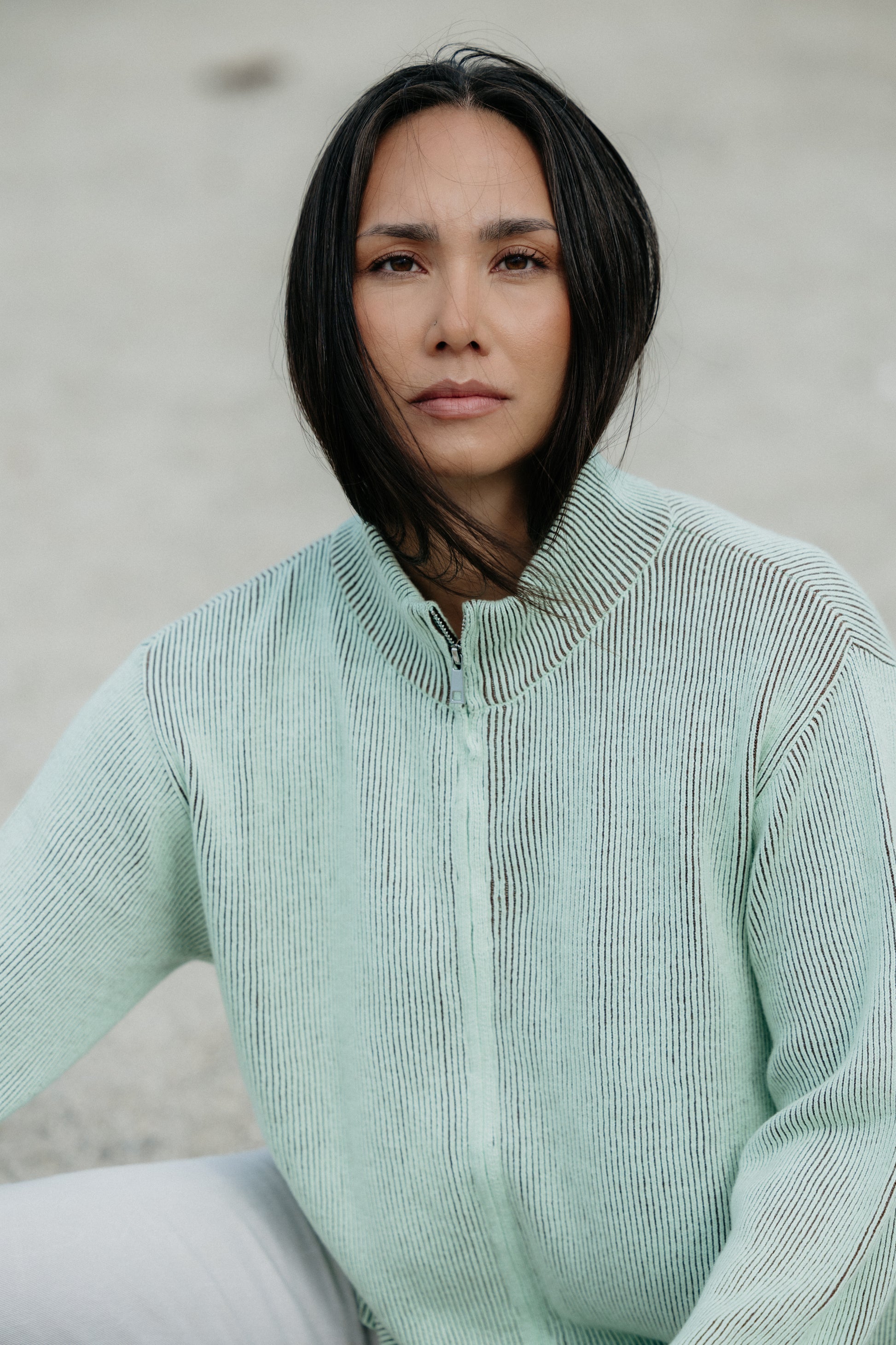 Myrkey er hin fullkomna oversized prjónapeysa sem hægt er að vera í á góðum notalegum stundum heimavið, í skólann og vinnuna. Peysan er rifflað prjónuð úr 80% bómull og 20% ull sem gerir hana létta og endingargóða, hún er með tvöföldum rennilás, 10cm klauf á hliðinni og kraga sem sem nær uppfyrir háls. Peysan er tvílituð sem gefur henni svo fallegt mynstur og áferð, hún er ætluð öllum kynjum og kemur í tveimur litum, ljósgrænu og ljósgráu.