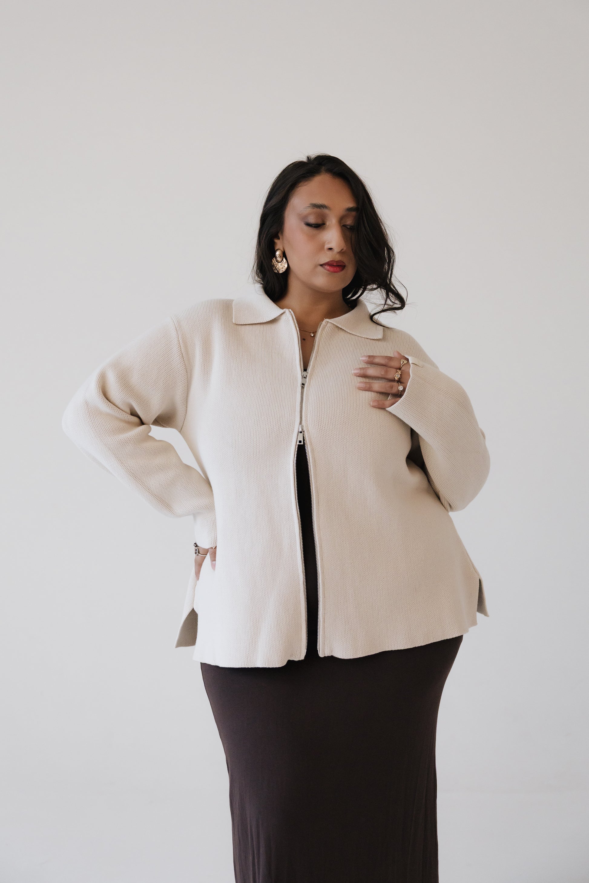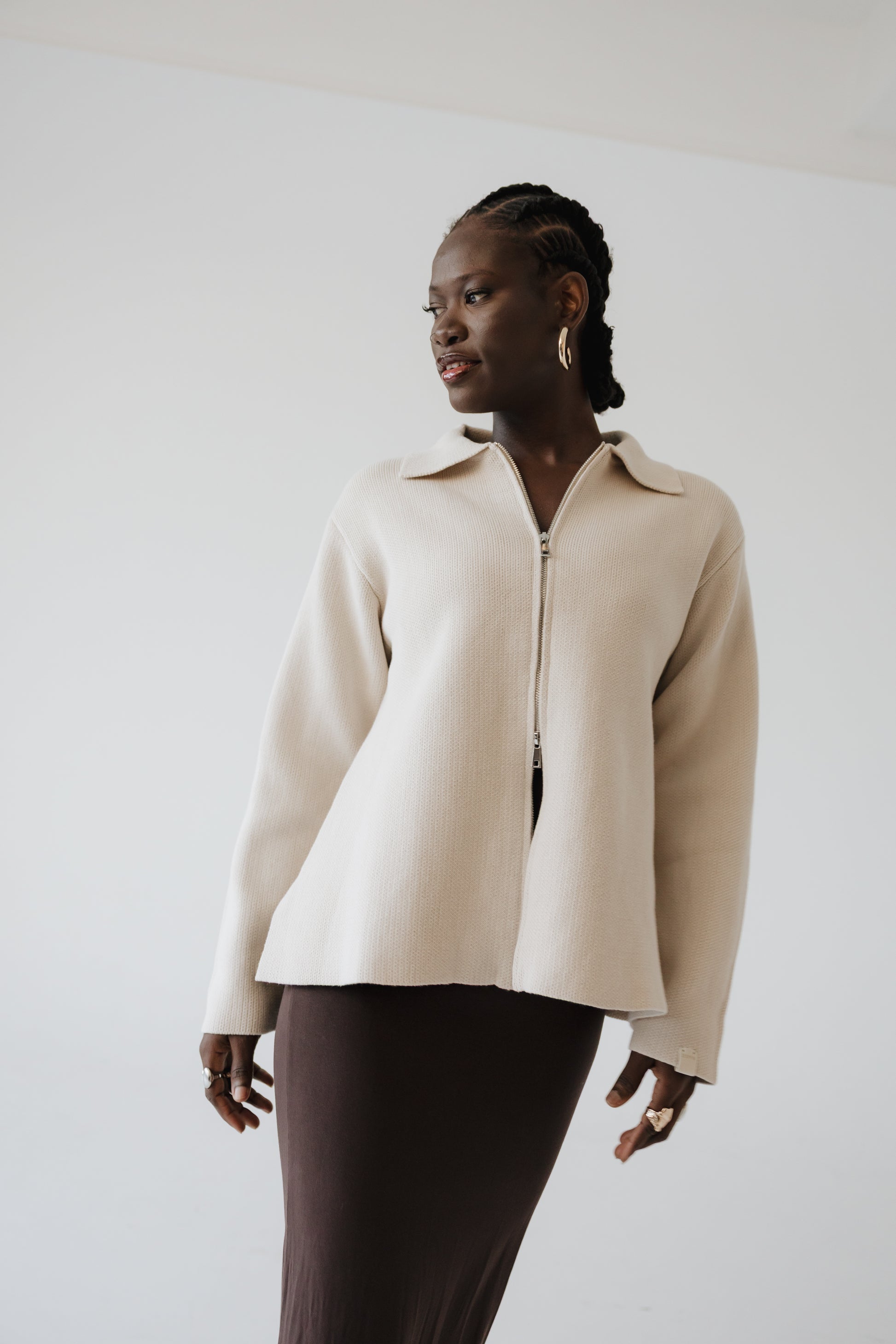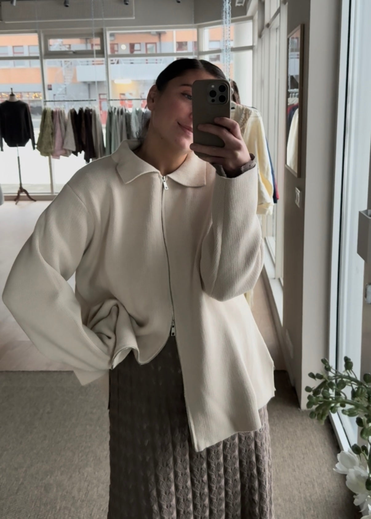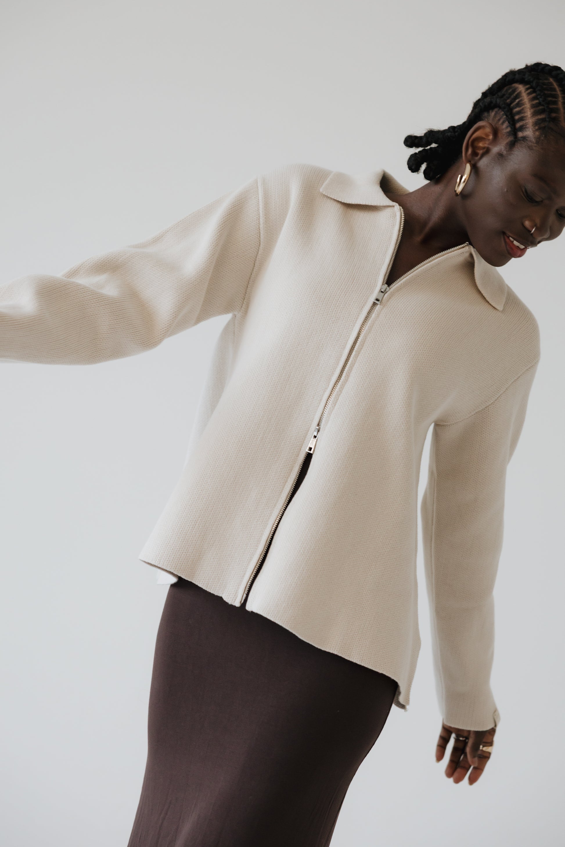 Pabba peysan er hin fullkomna oversized prjónaða peysa sem hægt er að vera í á góðum notalegum stundum heimavið og klæða upp með fallegu pilsi. Hún er prjónuð í 100% bómull sem gerir hana endingargóða með tvöföldum rennilás, 10cm klauf á hliðinni og léttum fallegum kraga. Peysan kemur í þremur stærðum og er hönnuð fyrir öll kyn.