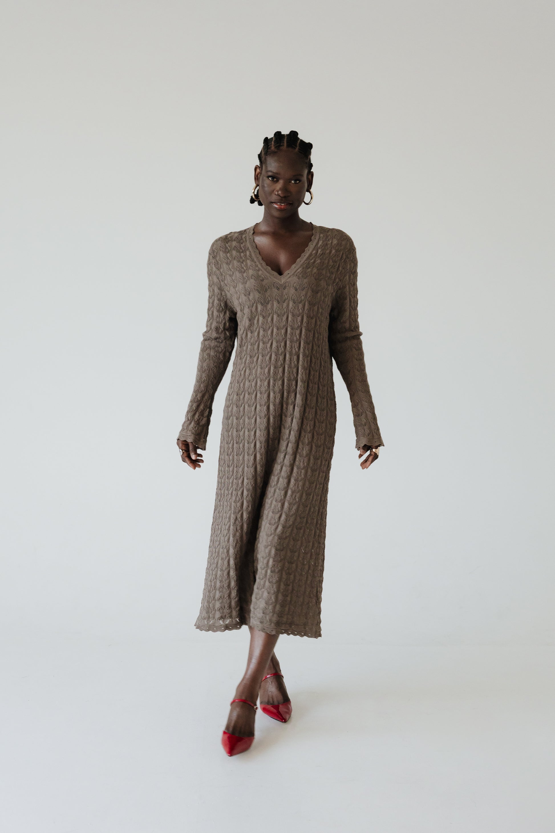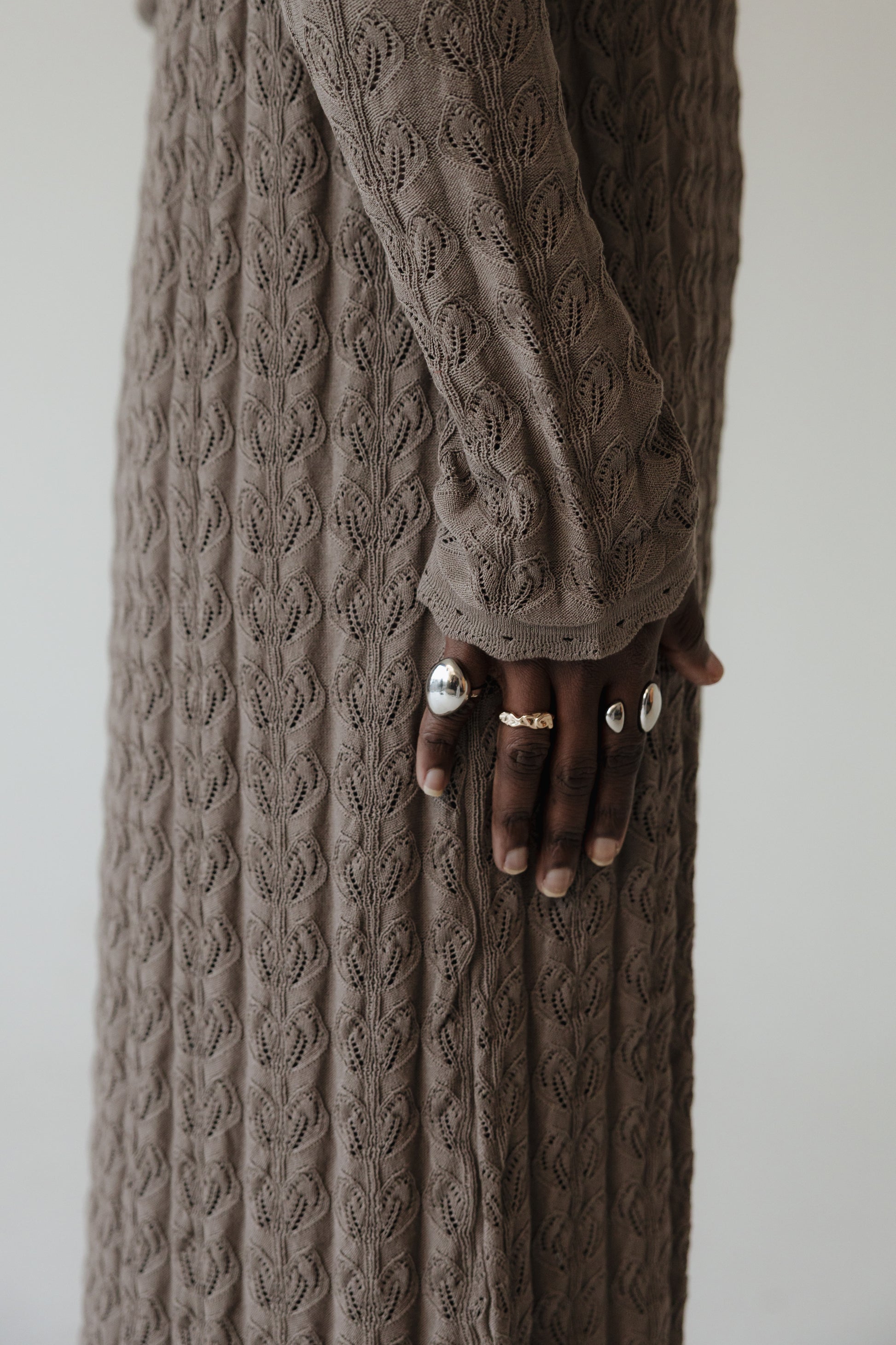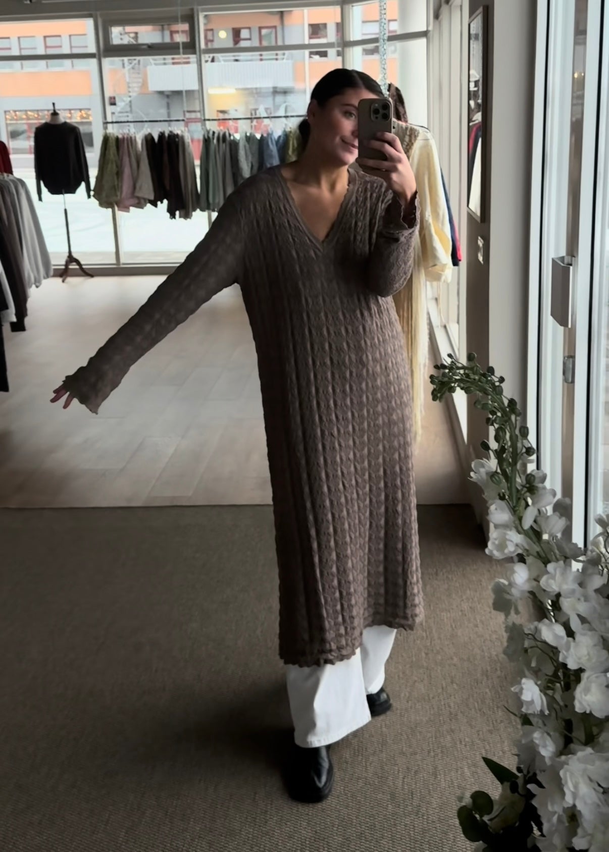 Lena er einstaklega fallegur léttprjónaður kjóll, sem hefur falleg og vönduð smáatriði í mynstri og á öllum endum. Sniðið á kjólnum er oversized, hann er með V hálsmál, mjög klæðilegur, þæginlegur og fullkomin fyrir sumarið! Auðvelt er að klæða hann fyrir hversdagsleikann, ferðalagið eða út á lífið.