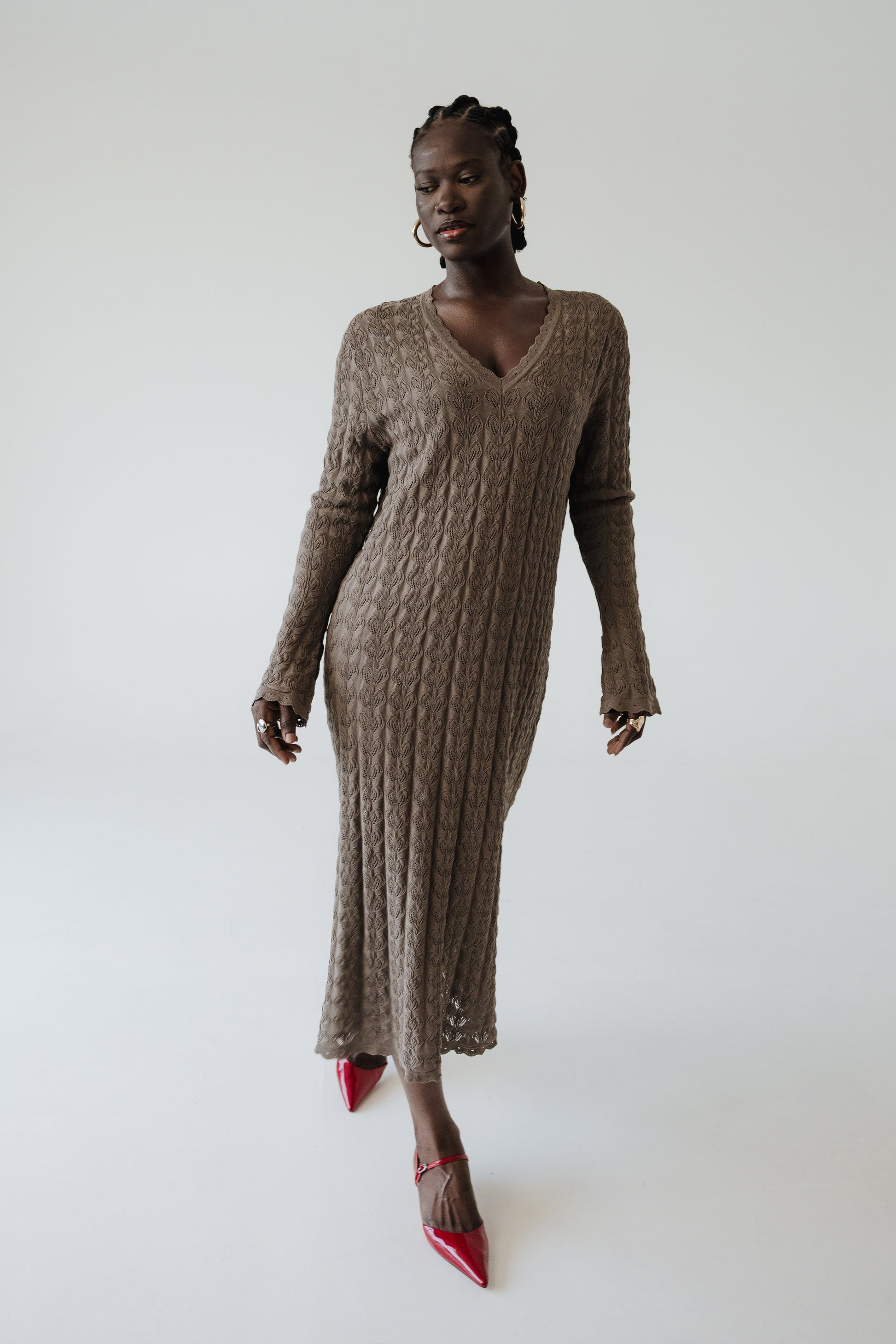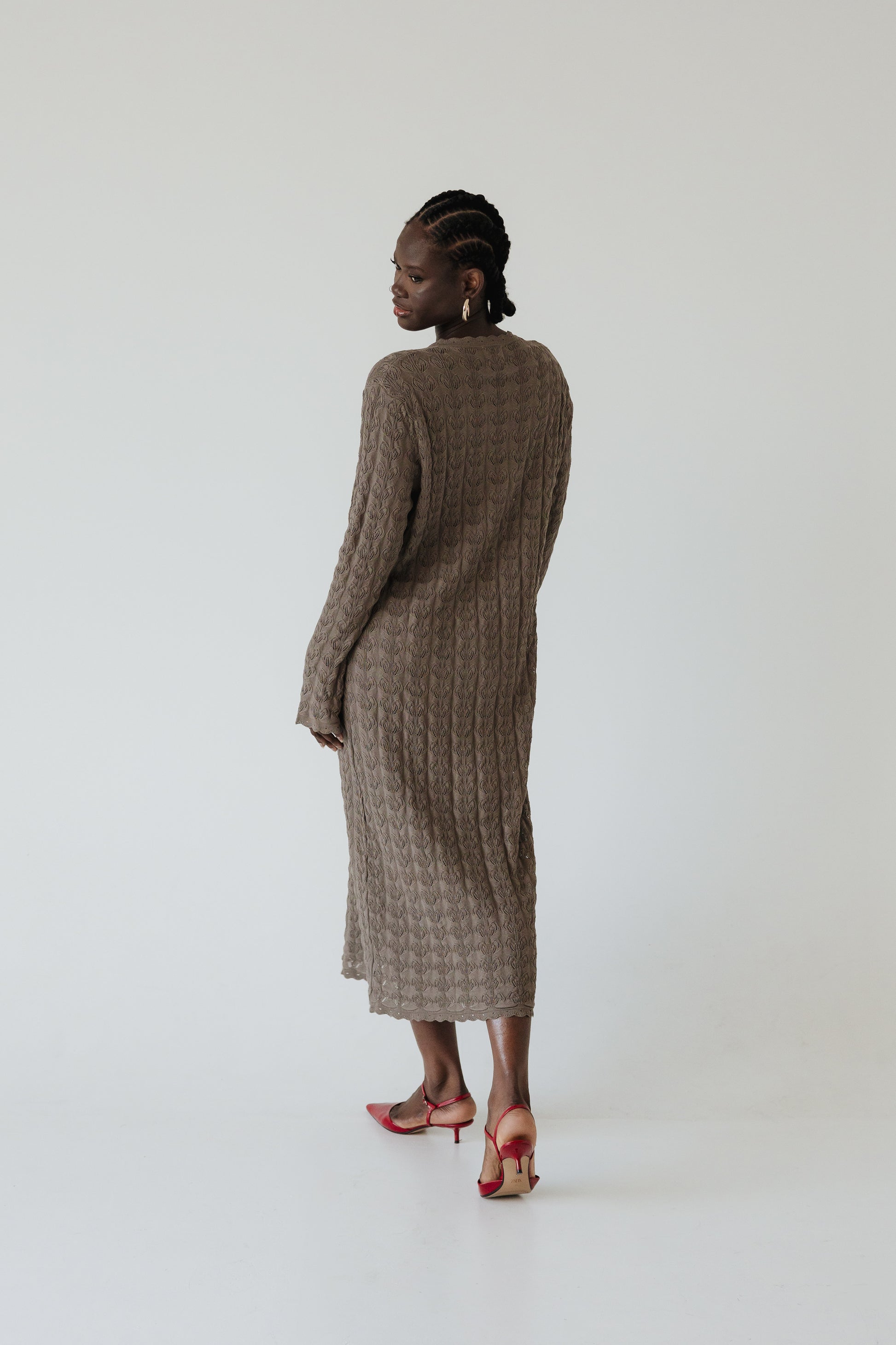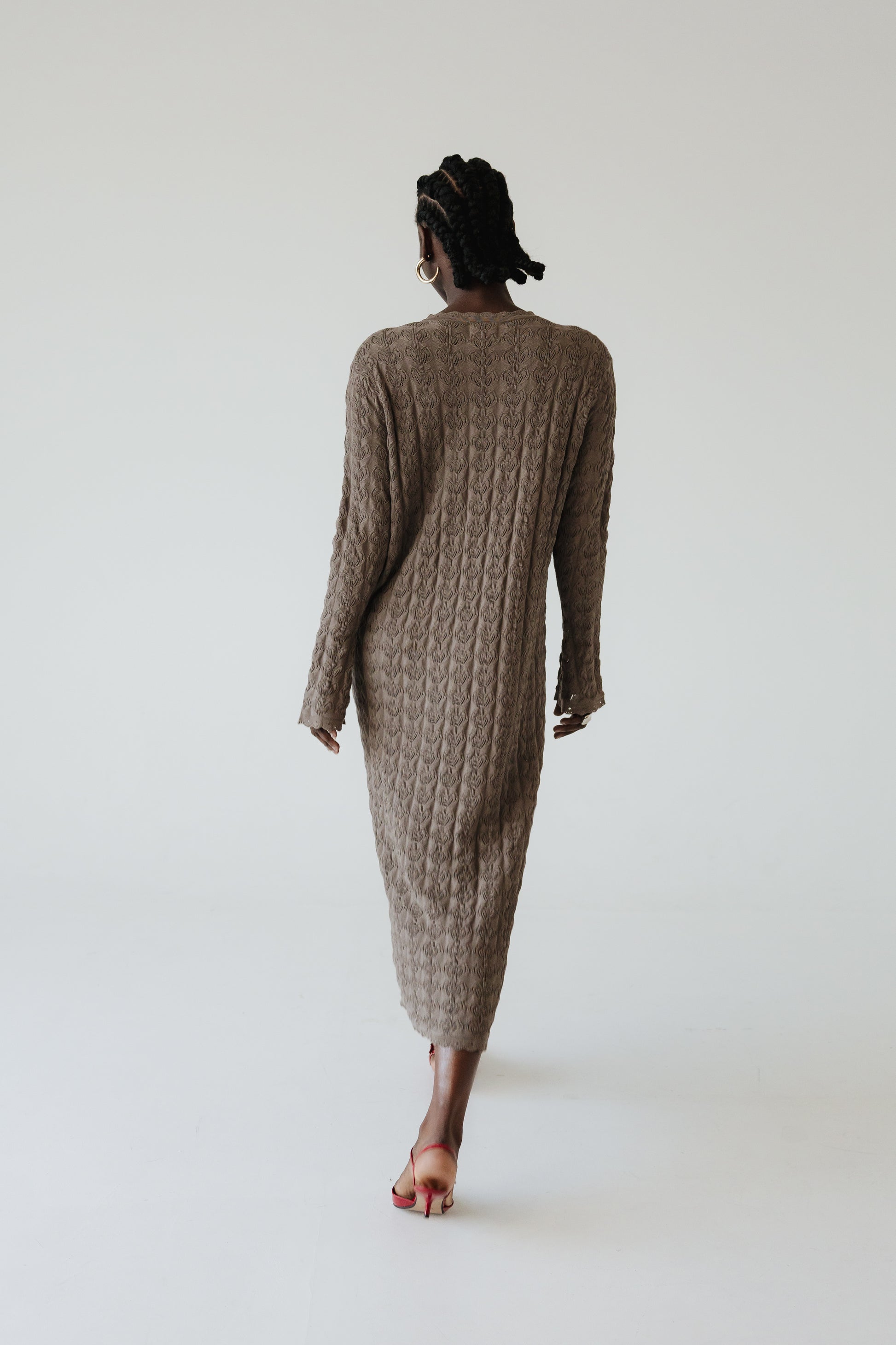 Lena er einstaklega fallegur léttprjónaður kjóll, sem hefur falleg og vönduð smáatriði í mynstri og á öllum endum. Sniðið á kjólnum er oversized, hann er með V hálsmál, mjög klæðilegur, þæginlegur og fullkomin fyrir sumarið! Auðvelt er að klæða hann fyrir hversdagsleikann, ferðalagið eða út á lífið.