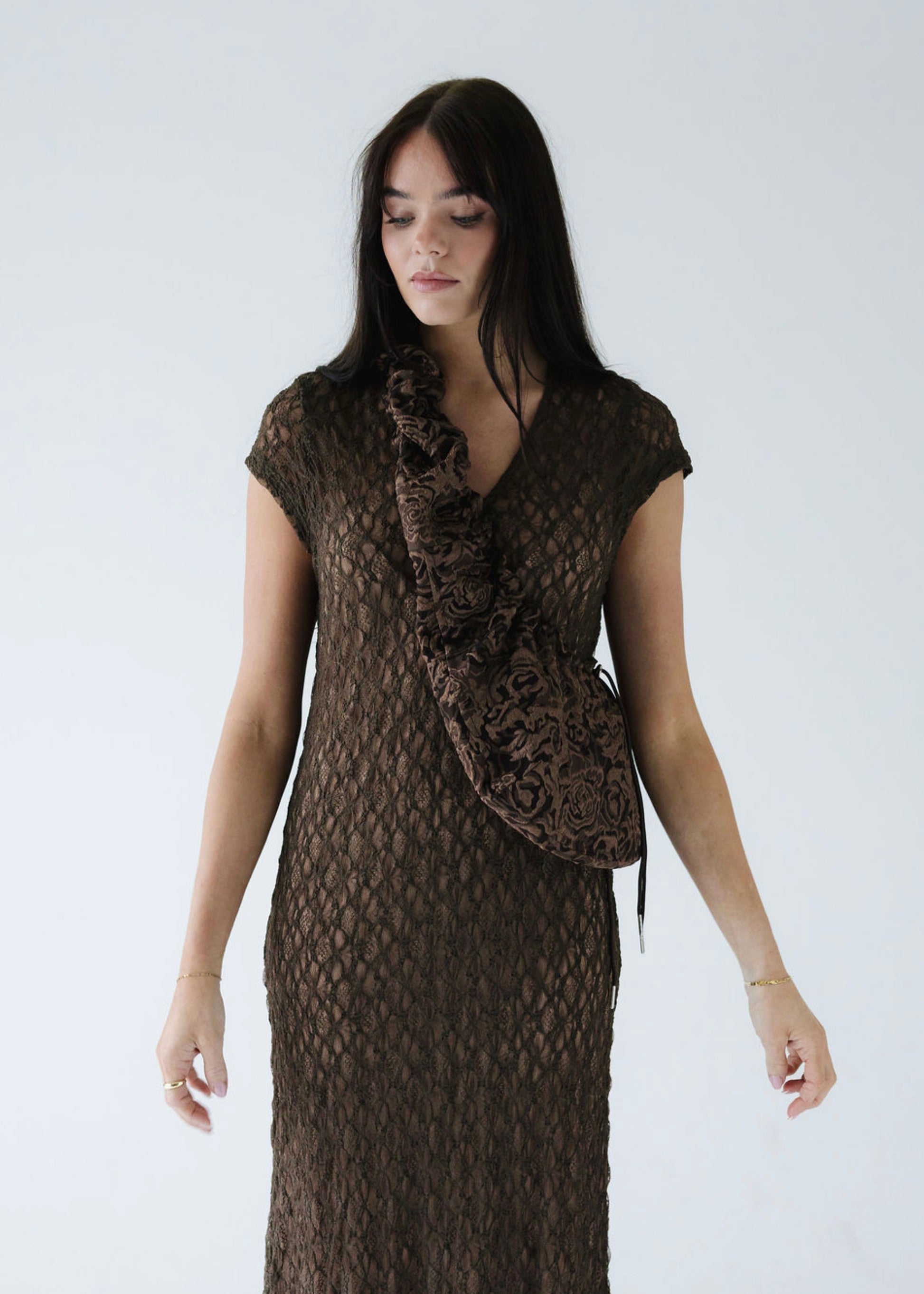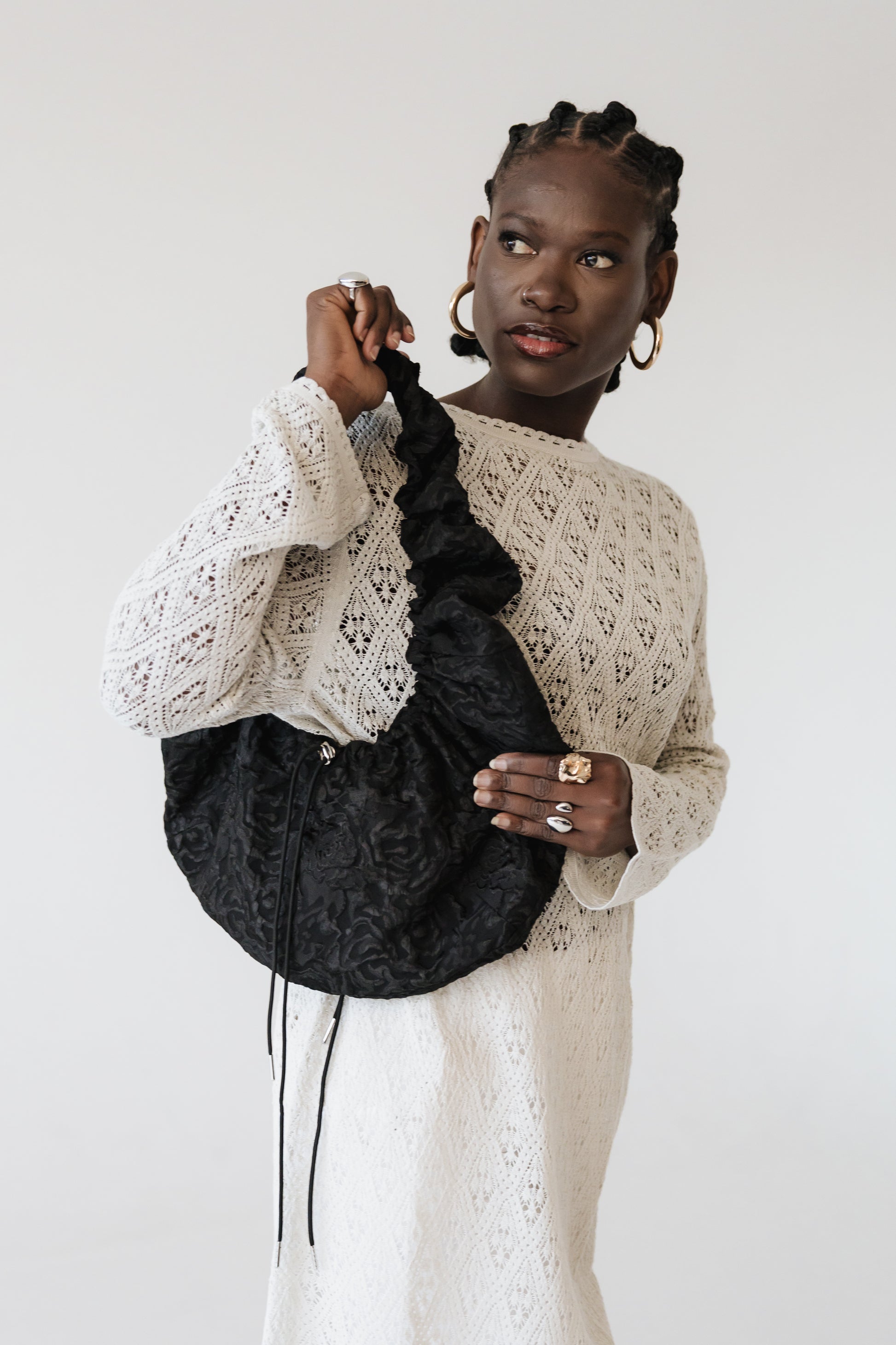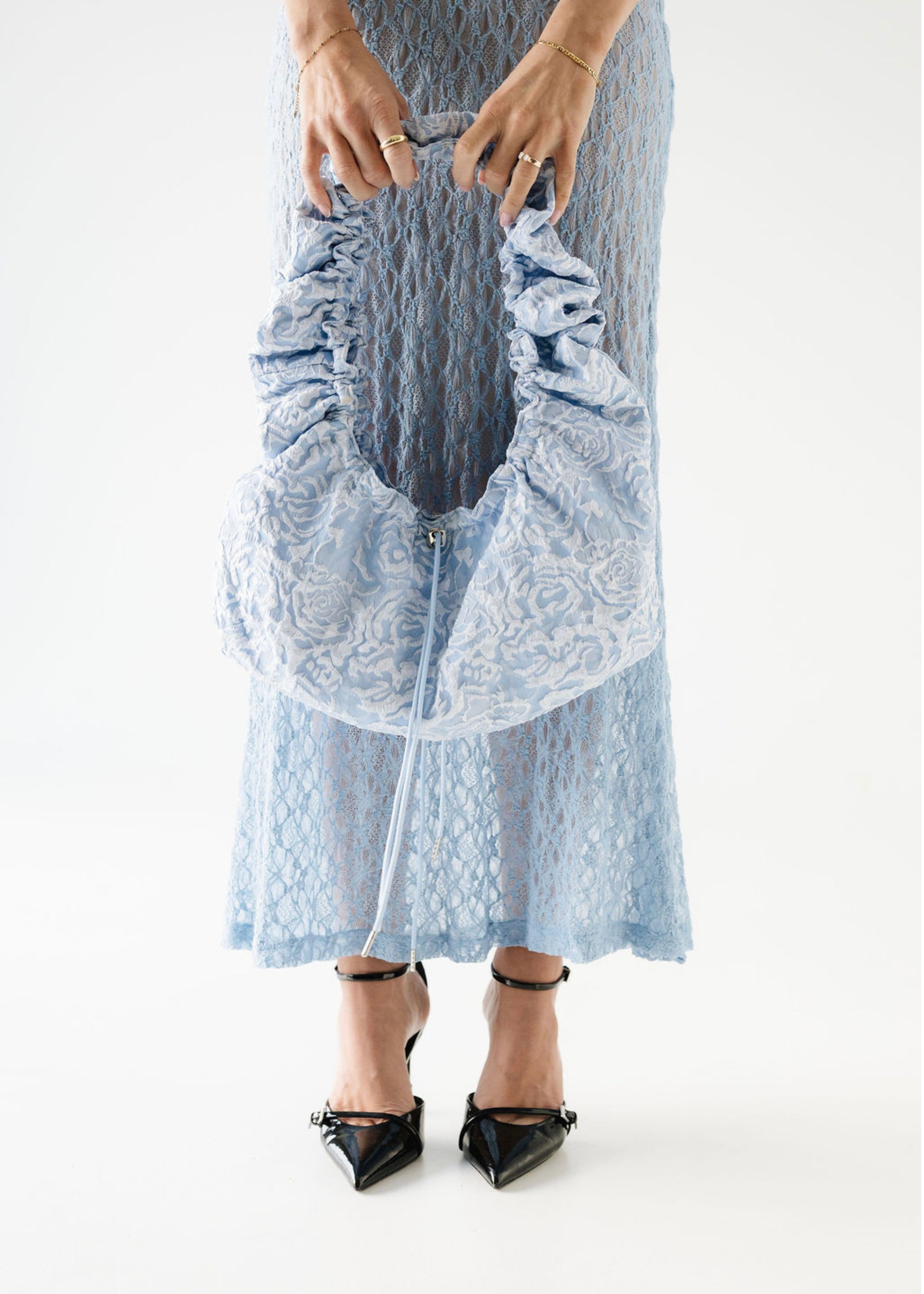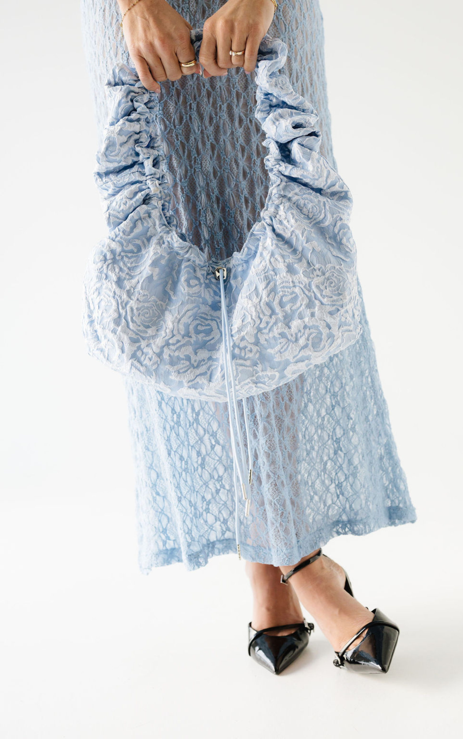 May taskan sameinar þægindi og stíl. Hver og einn getur auðveldlega stillt lengdina eftir eigin þörfum með böndum sitthvoru megin, hvort sem hún er borin á annarri öxlinni eða þvert yfir líkamann. Efnið er fallegt með blóma mynstri og hefur smá stífleika sem tryggir að taskan heldur sínu formi.