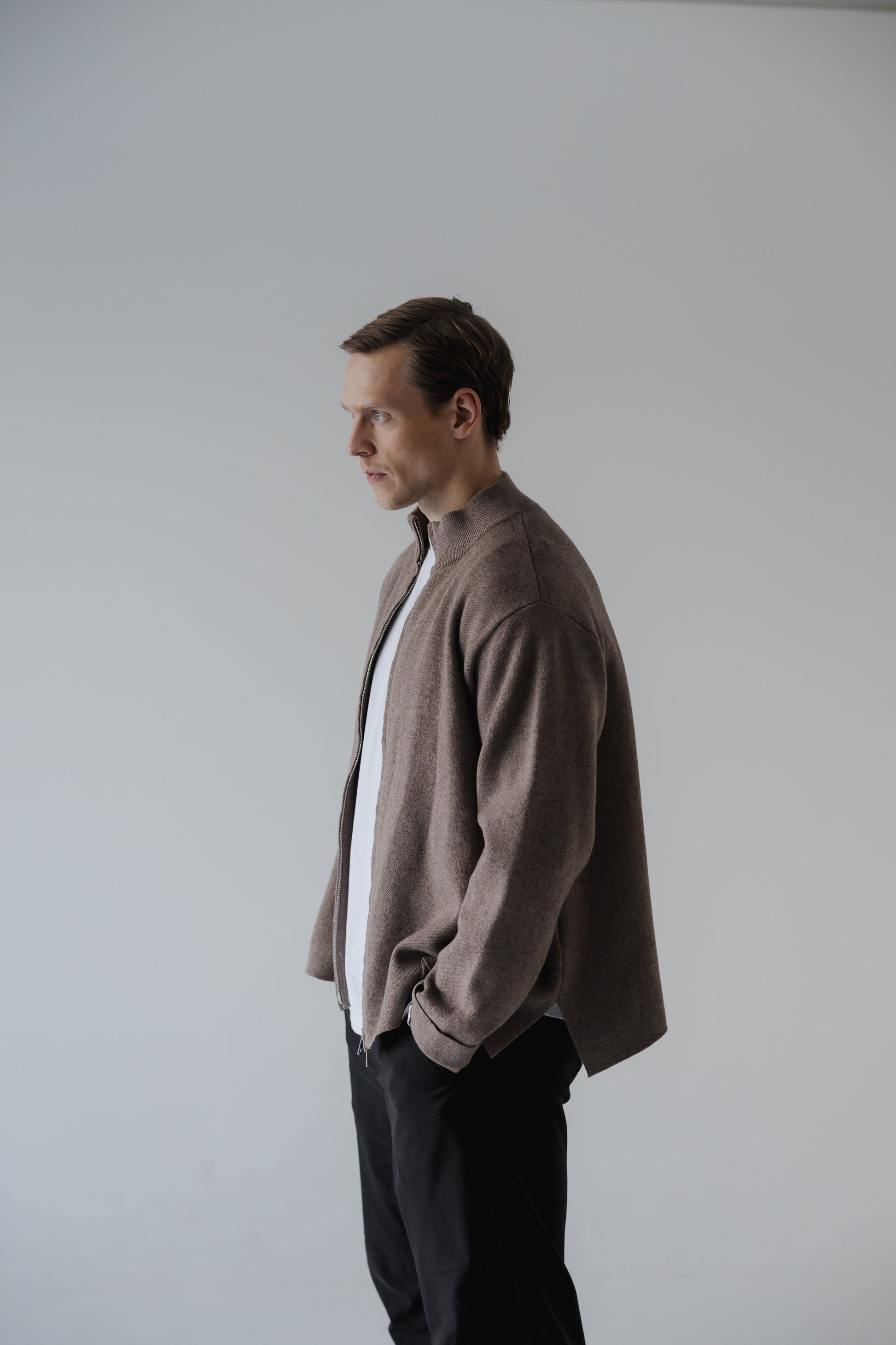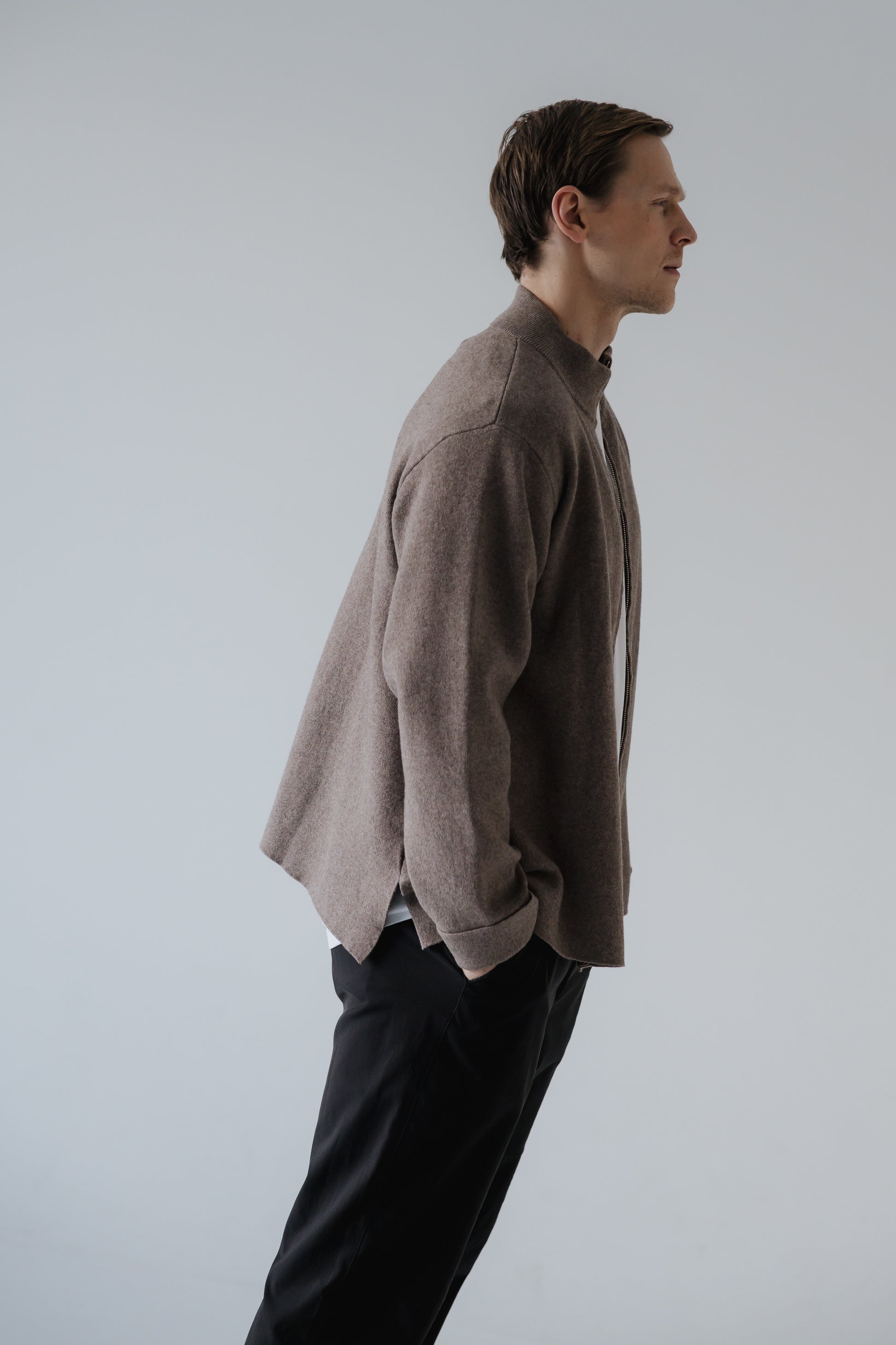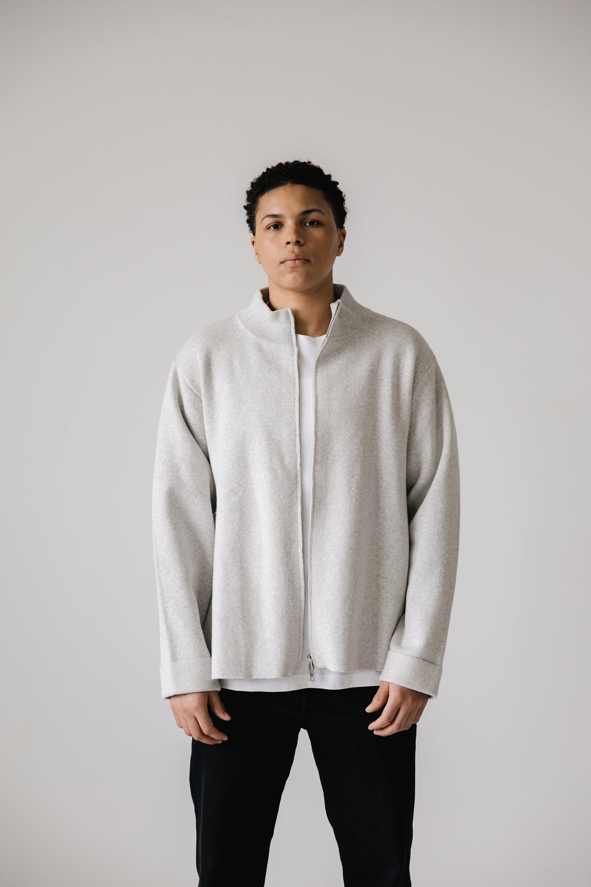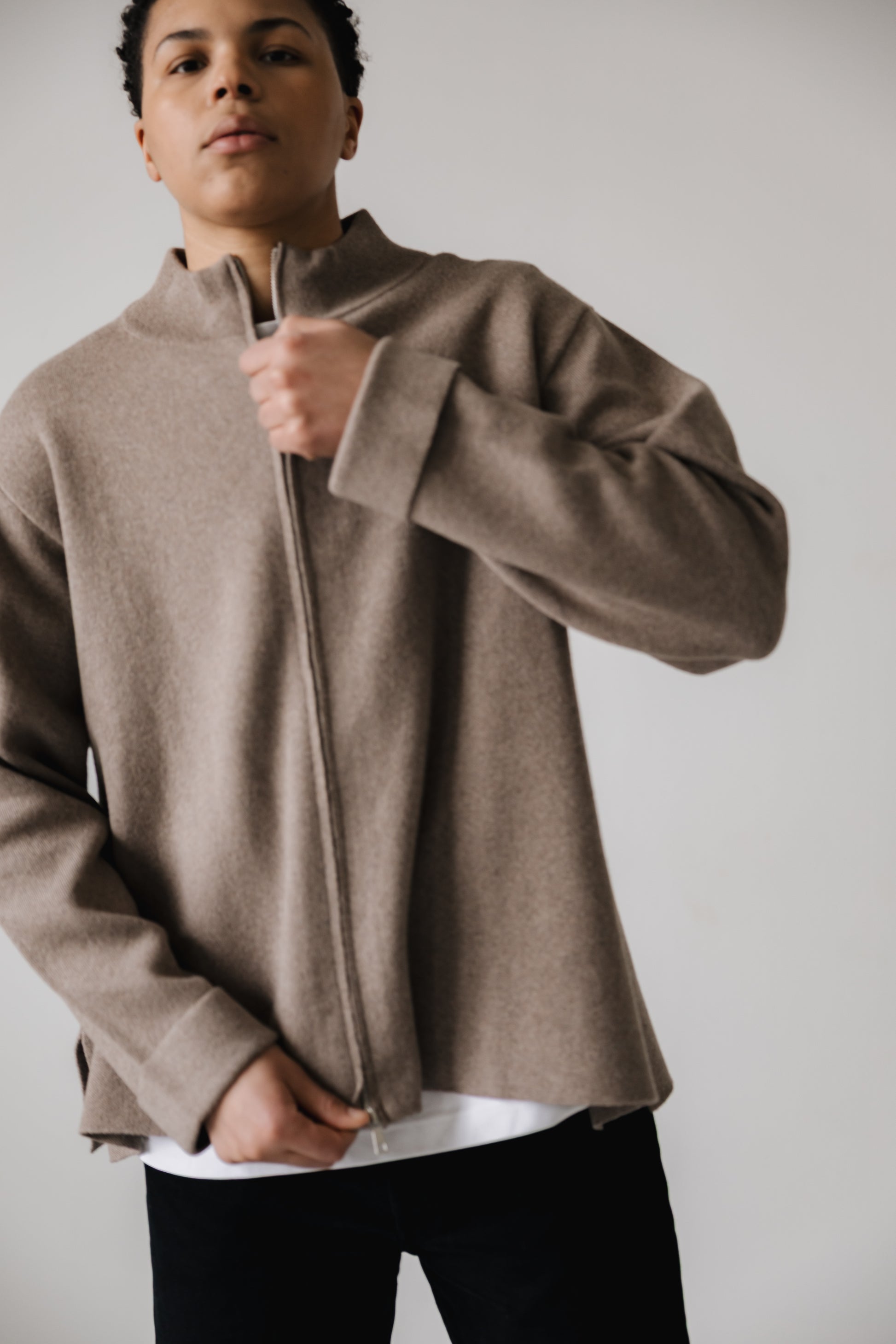 Þoka er hin fullkomna oversized prjónapeysa sem hægt er að vera í á góðum notalegum stundum heimavið og hentar vel fyrir íslenska sumarið. Hún er prjónuð úr 80% bómull og 20% ull sem gerir hana létta og endingargóða, hún er með tvöföldum rennilás, 10cm klauf á hliðinni og kraga sem sem nær uppfyrir háls. Peysan er ætluð öllum kynjum.