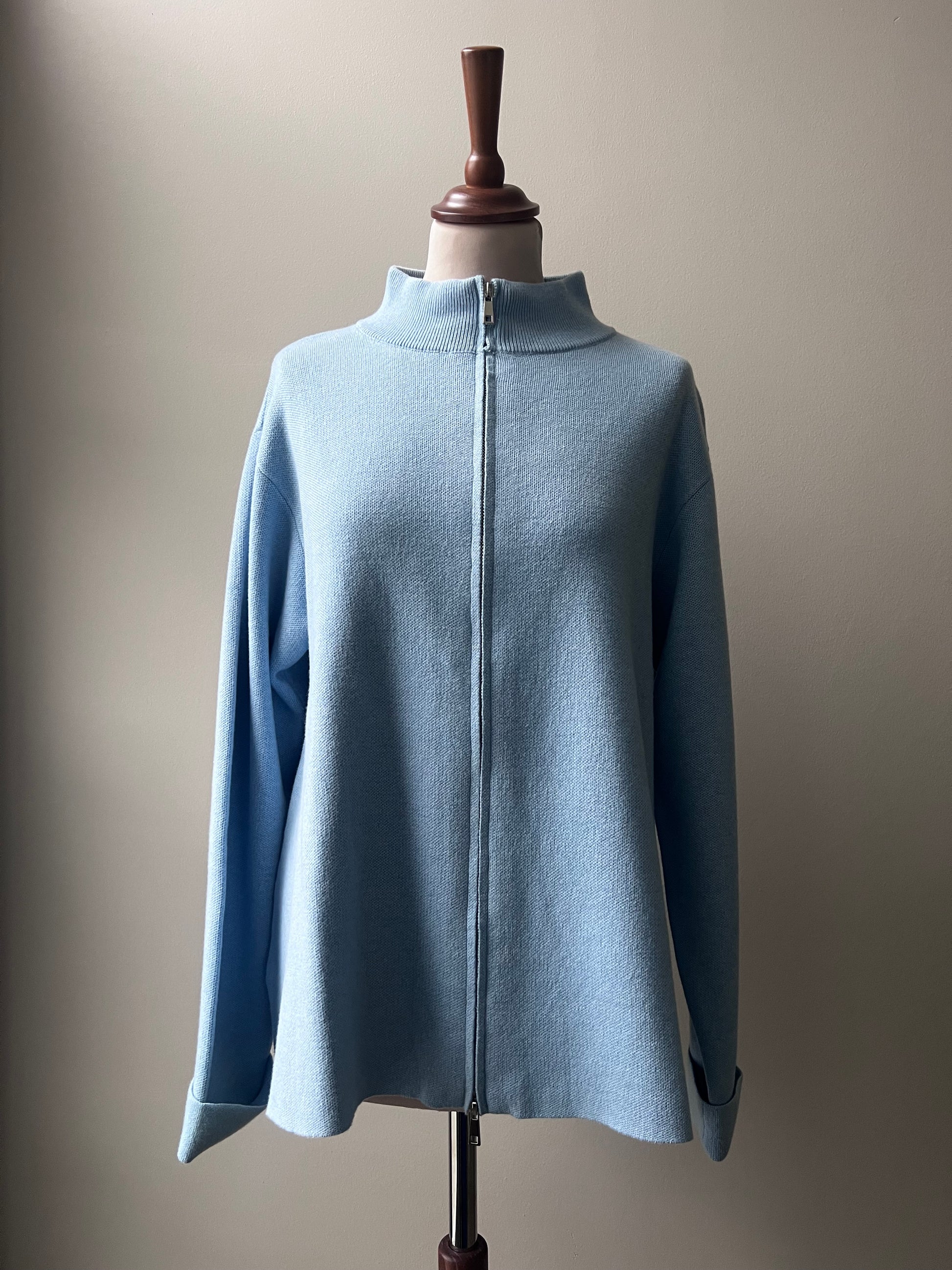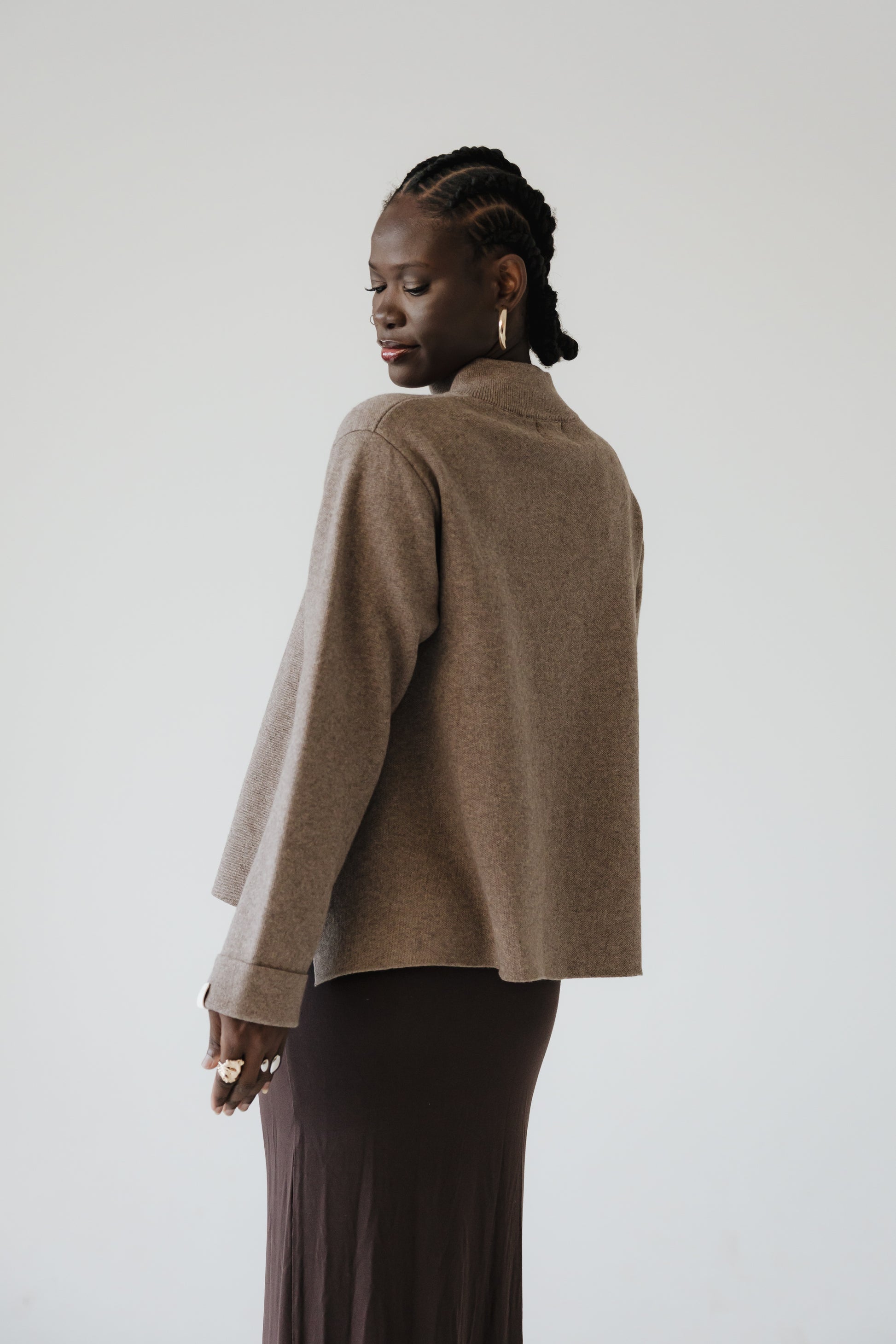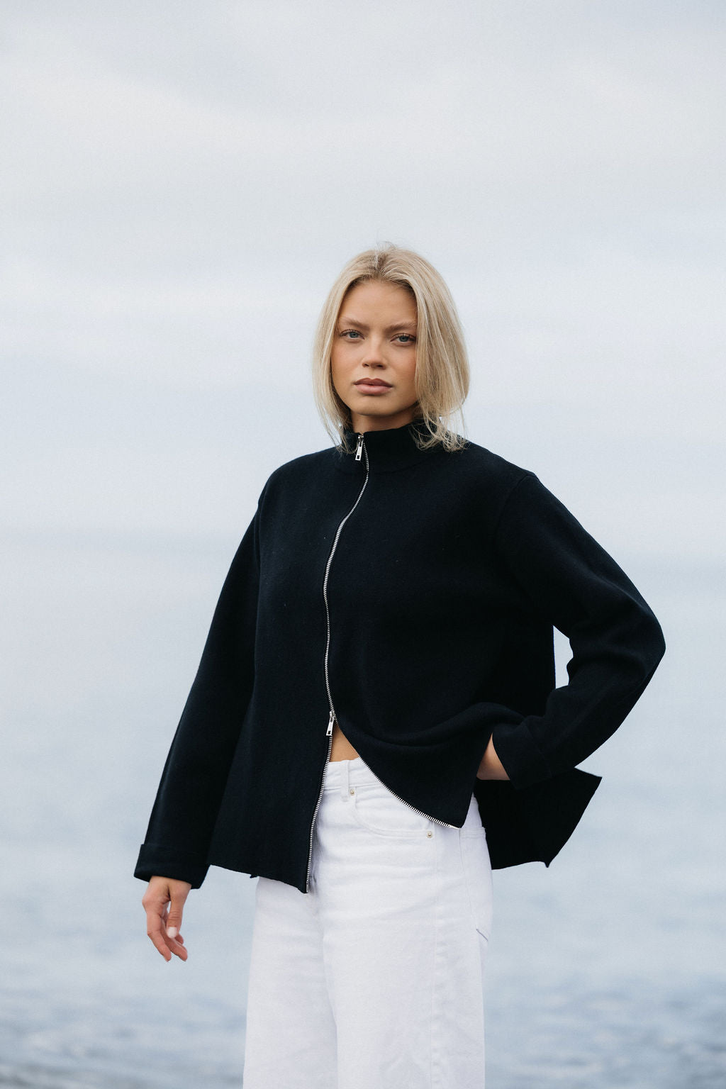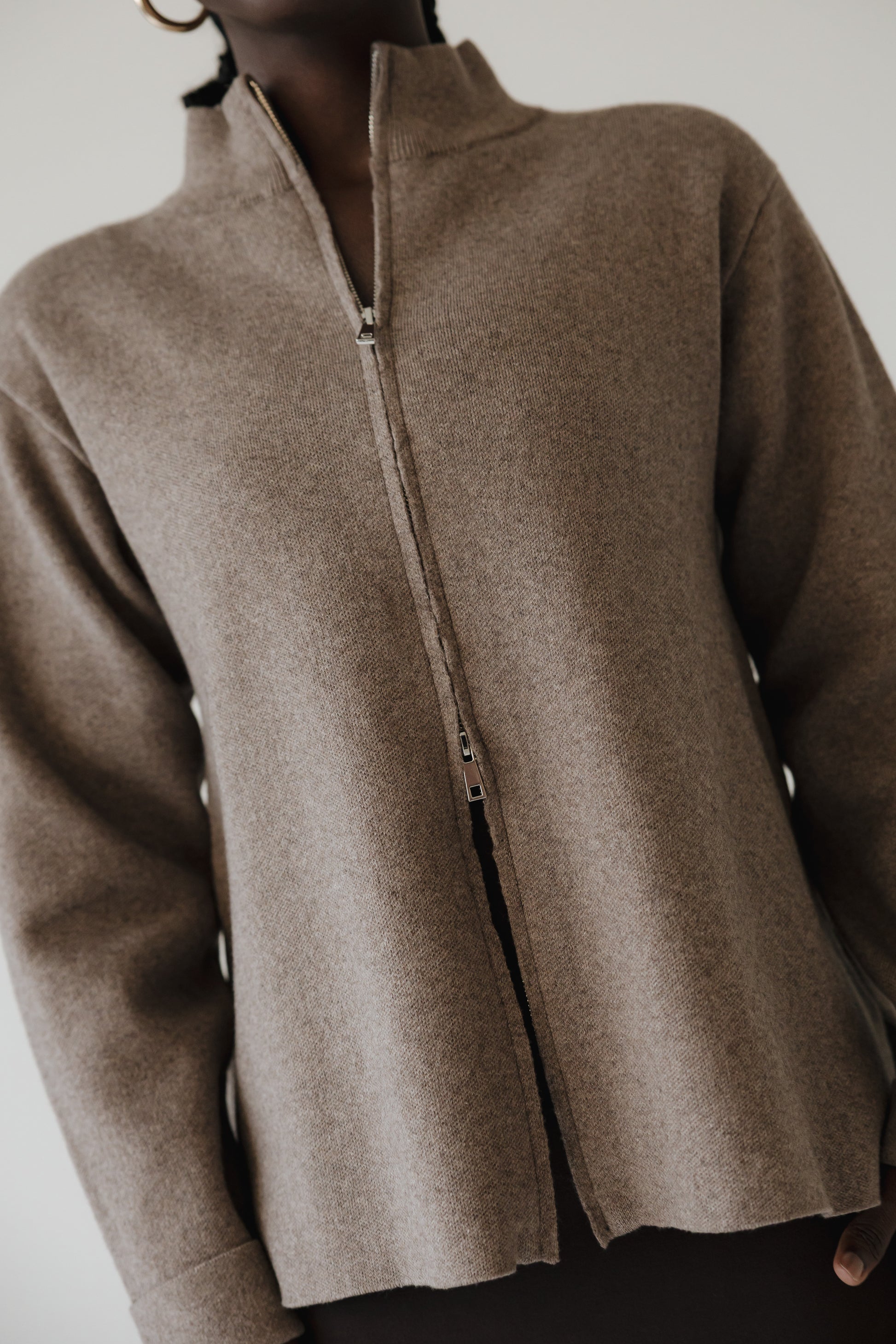 Þoka er hin fullkomna oversized prjónapeysa sem hægt er að vera í á góðum notalegum stundum heimavið og hentar vel fyrir íslenska sumarið. Hún er prjónuð úr 80% bómull og 20% ull sem gerir hana létta og endingargóða, hún er með tvöföldum rennilás, 10cm klauf á hliðinni og kraga sem sem nær uppfyrir háls. Peysan er ætluð öllum kynjum og kemur í tveimur litum, ljósbrúnu og ljósgráu.