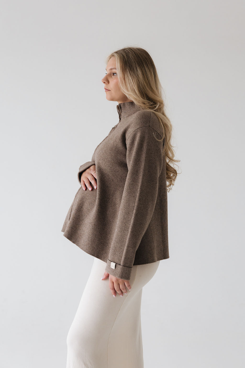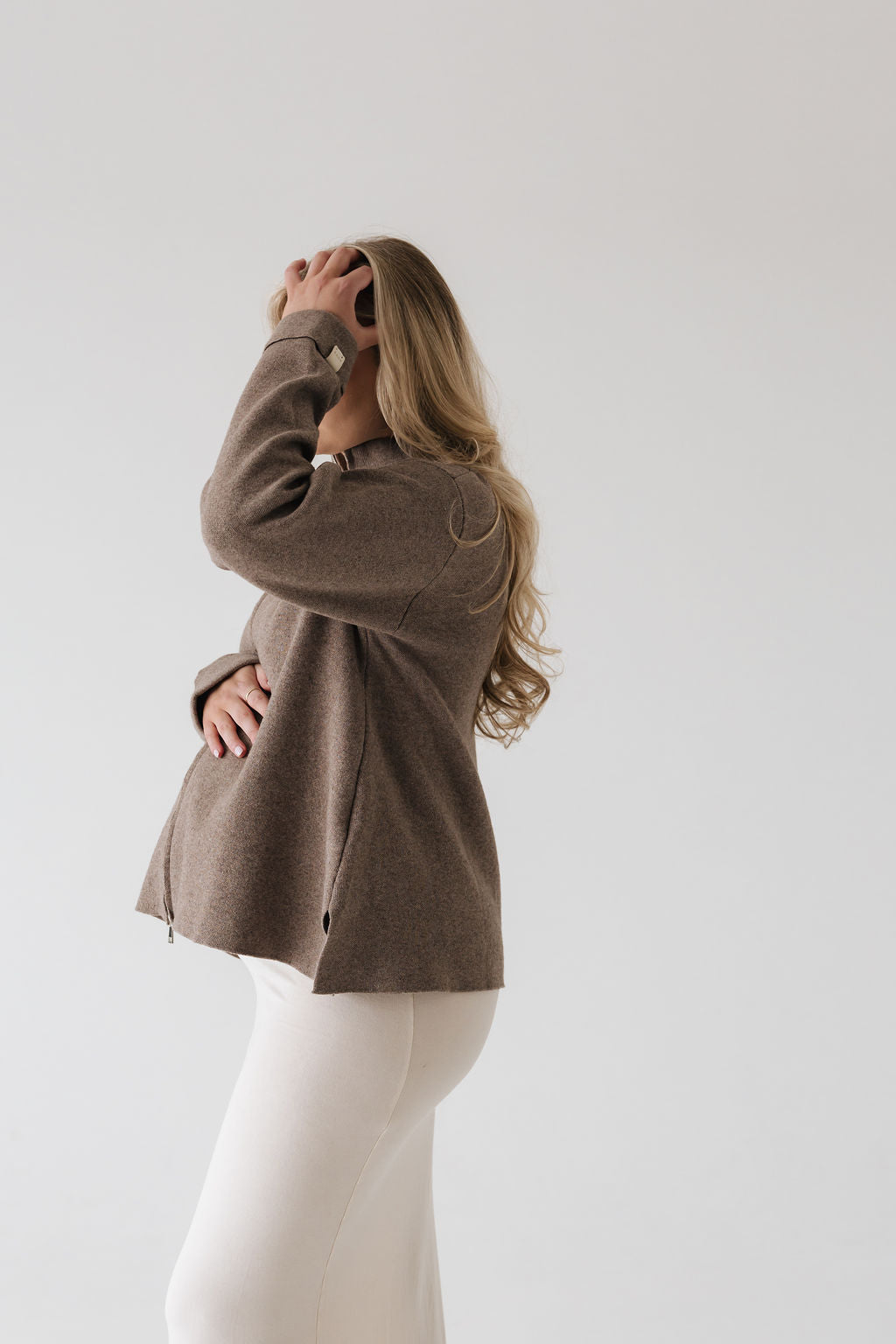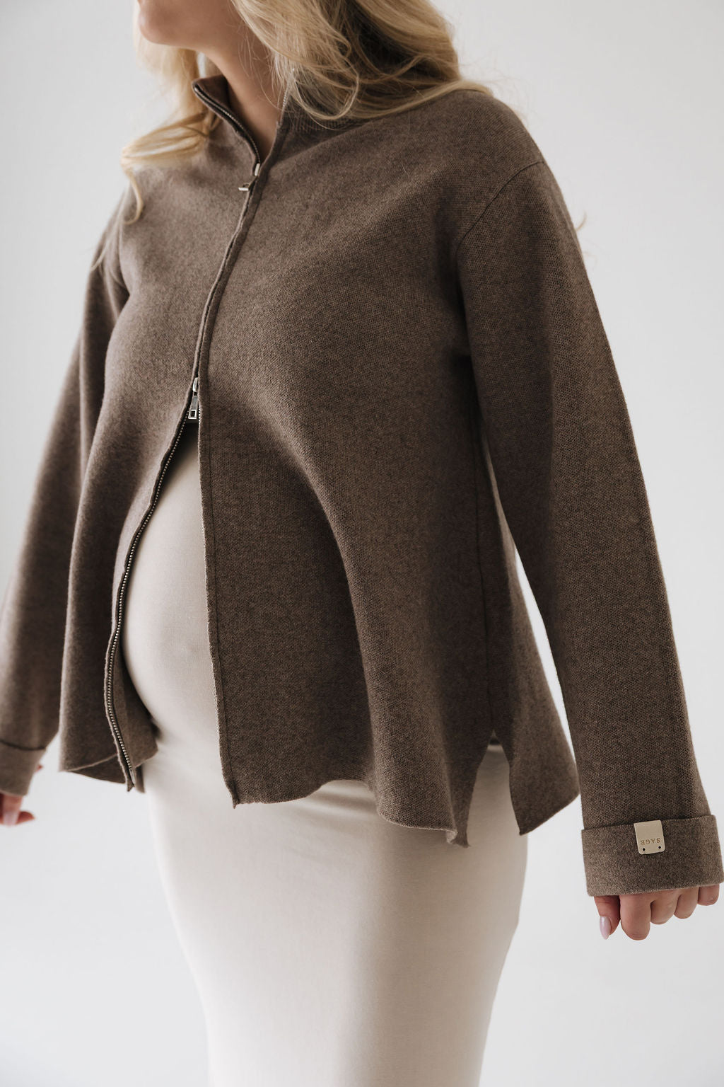 Þoka er hin fullkomna oversized prjónapeysa sem hægt er að vera í á góðum notalegum stundum heimavið og hentar vel fyrir íslenska sumarið. Hún er prjónuð úr 80% bómull og 20% ull sem gerir hana létta og endingargóða, hún er með tvöföldum rennilás, 10cm klauf á hliðinni og kraga sem sem nær uppfyrir háls.