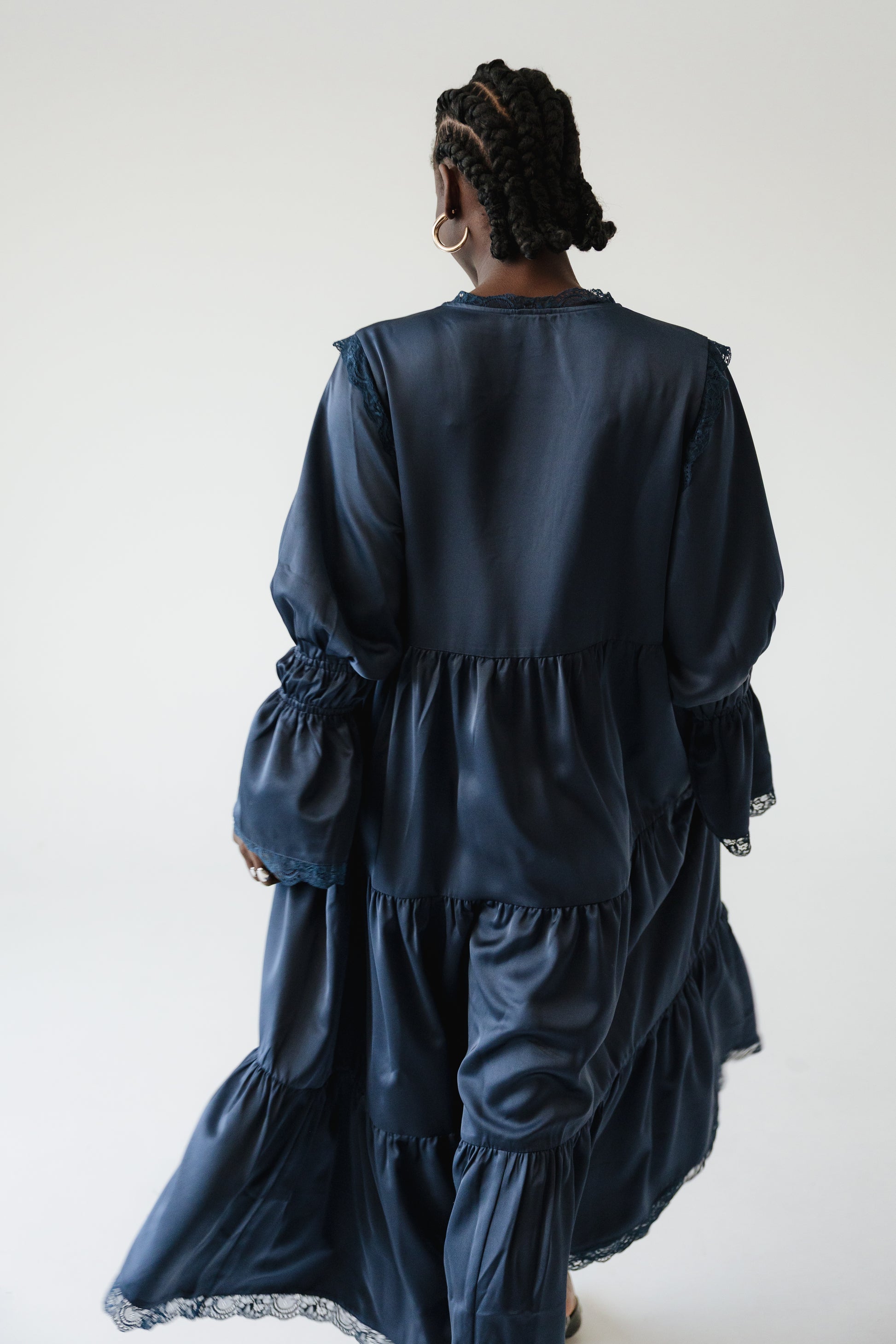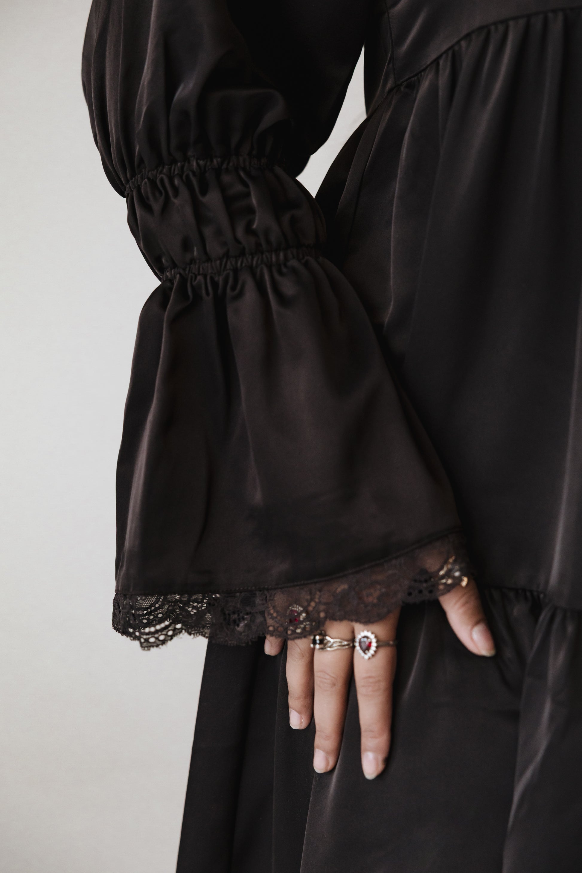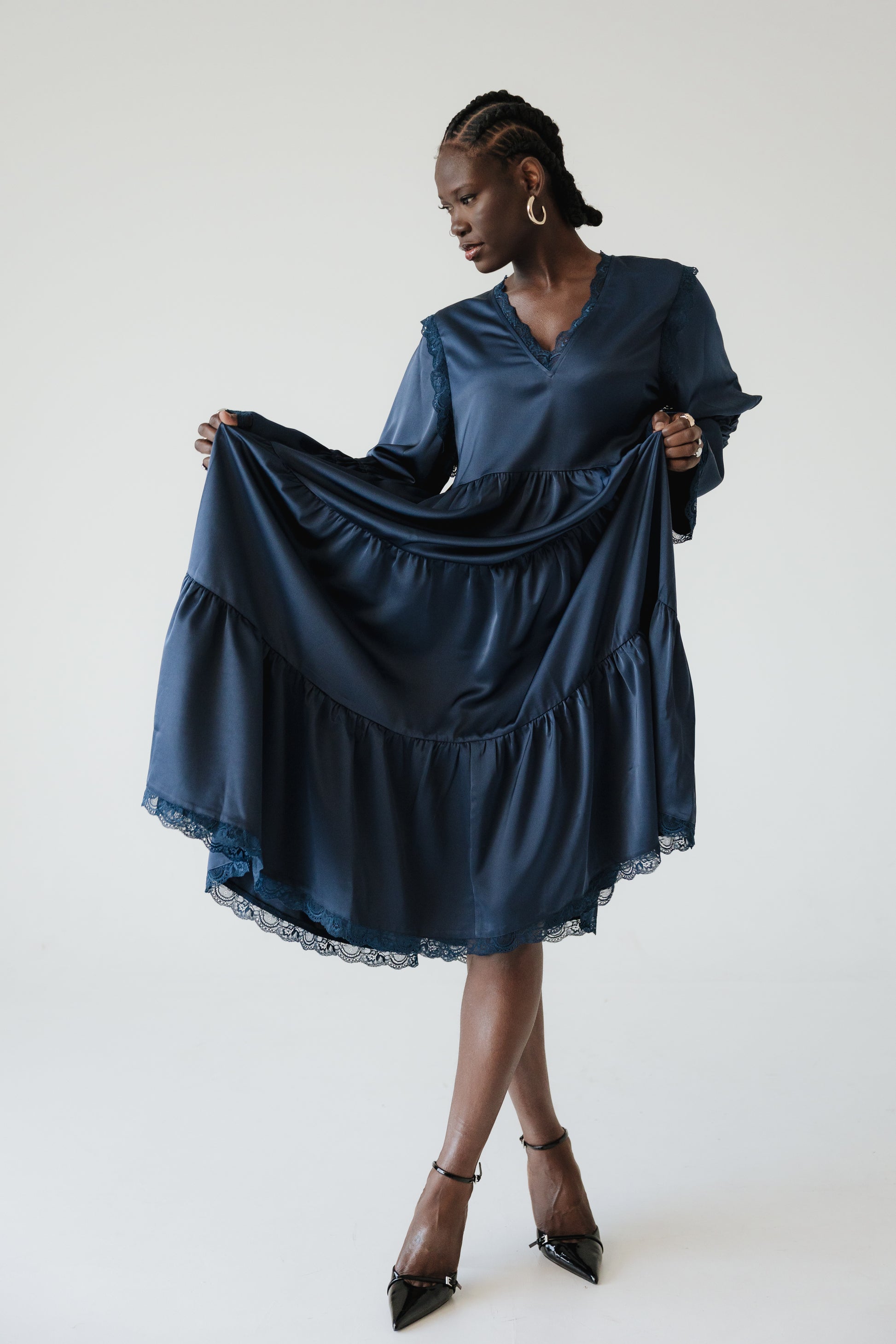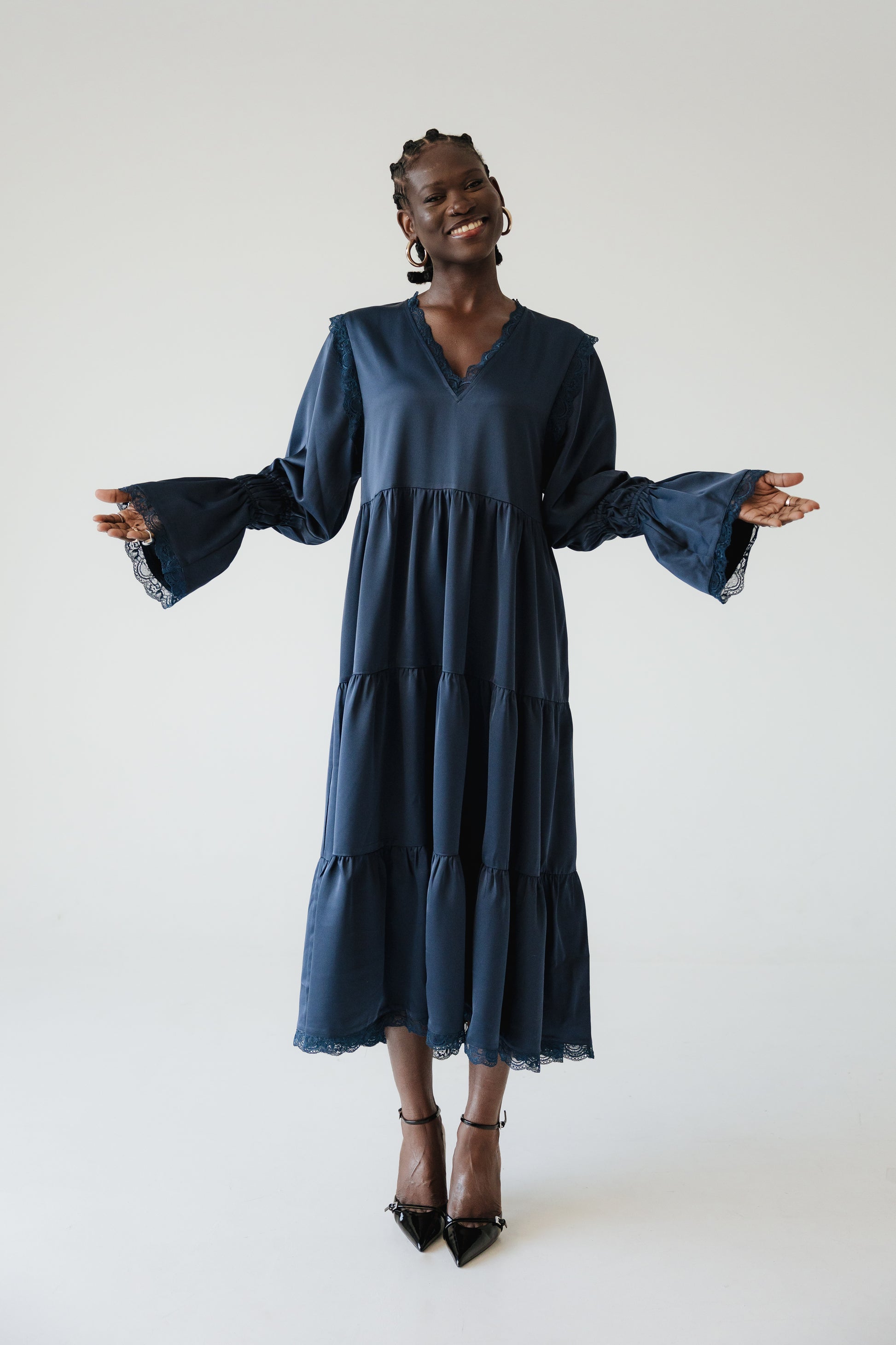 Von er komin aftur í hátíðarbúning! Kjóllinn kemur í dökkbláu og expresso brúnum og er klæðilegur, flæðandi og fallegur. Á öllum endum, öxlum og við hálsmál er falleg vönduð blúnda sem gerir flíkina einstaka. Ermarnar eru útvíðar en dregnar saman með tveimur teygjum aðeins fyrir ofan úlnlið. Von var hönnuð með það að markmiði að búa til tímalausa flík sem hægt er að nota á öllum árstímum og fyrir öll tilefni.