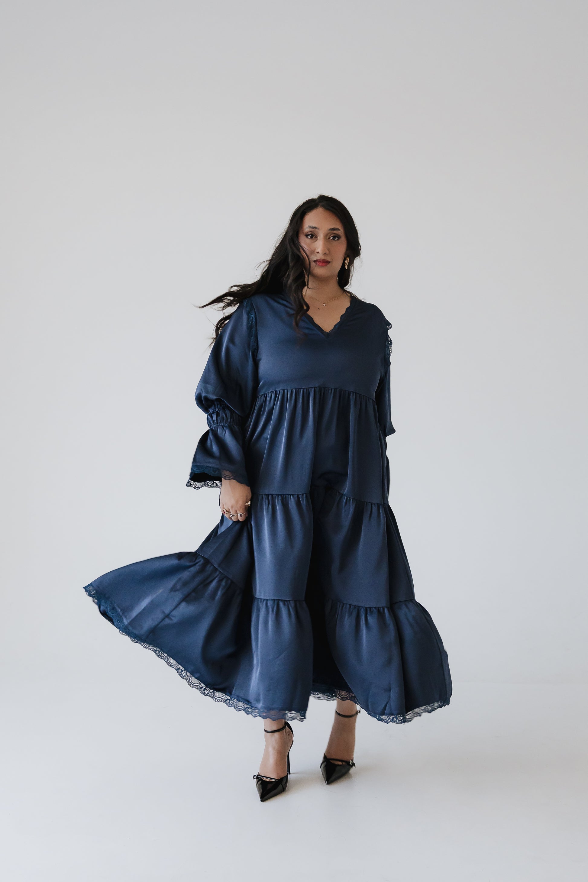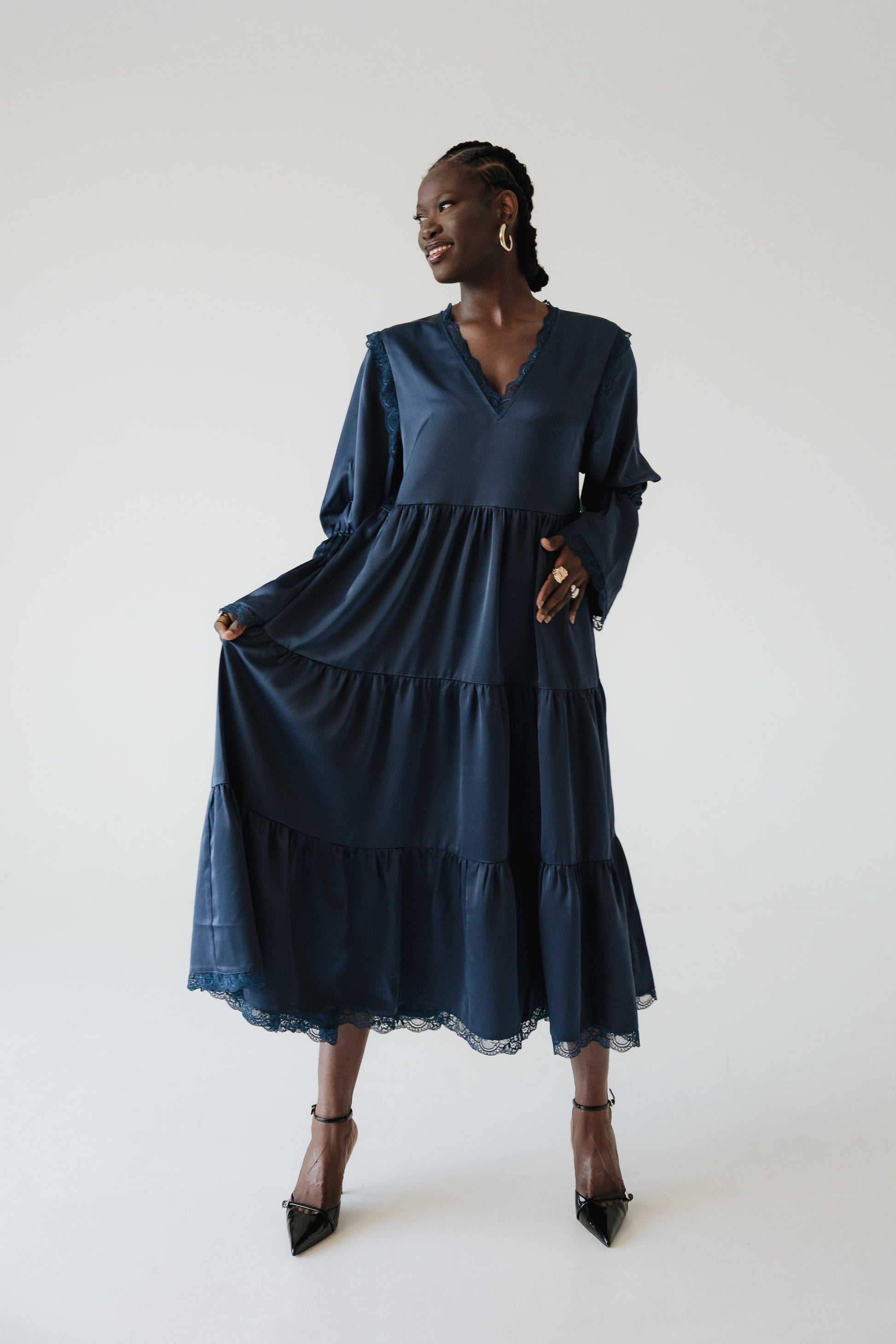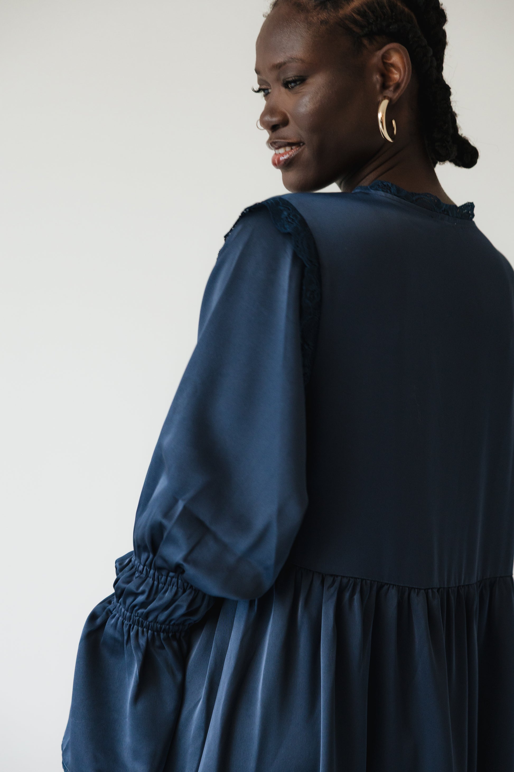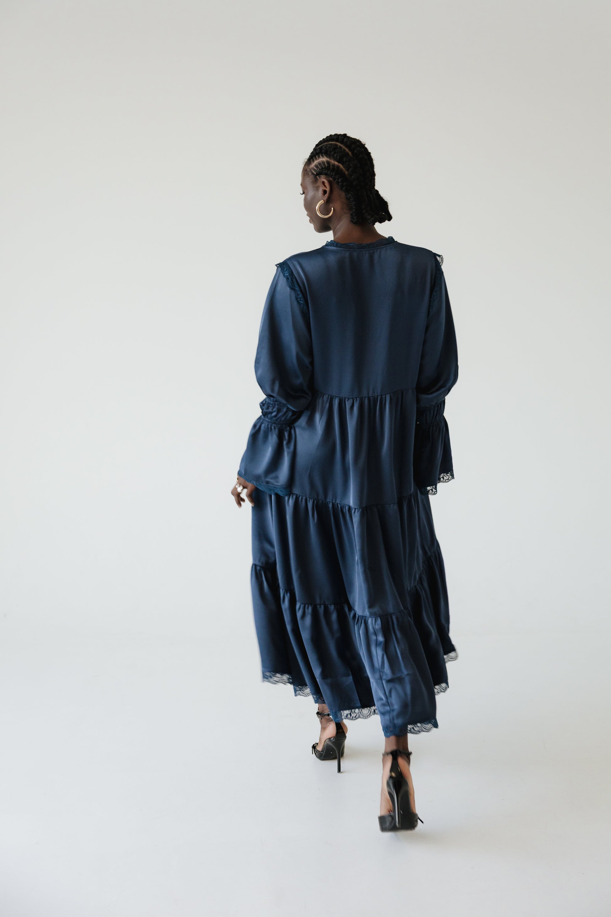 Von er komin aftur í hátíðarbúning! Kjóllinn kemur í dökkbláu og expresso brúnum og er klæðilegur, flæðandi og fallegur. Á öllum endum, öxlum og við hálsmál er falleg vönduð blúnda sem gerir flíkina einstaka. Ermarnar eru útvíðar en dregnar saman með tveimur teygjum aðeins fyrir ofan úlnlið. Von var hönnuð með það að markmiði að búa til tímalausa flík sem hægt er að nota á öllum árstímum og fyrir öll tilefni.