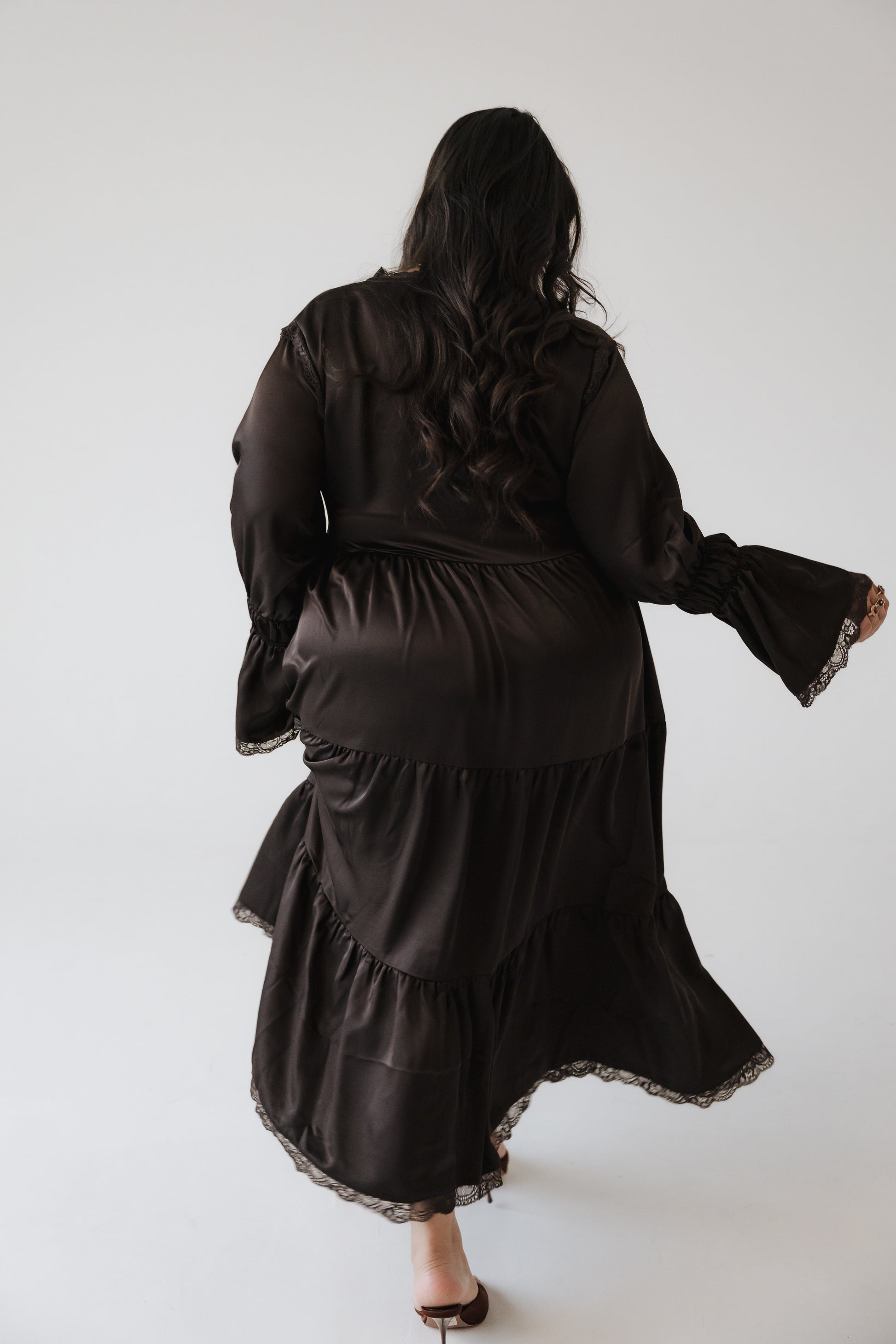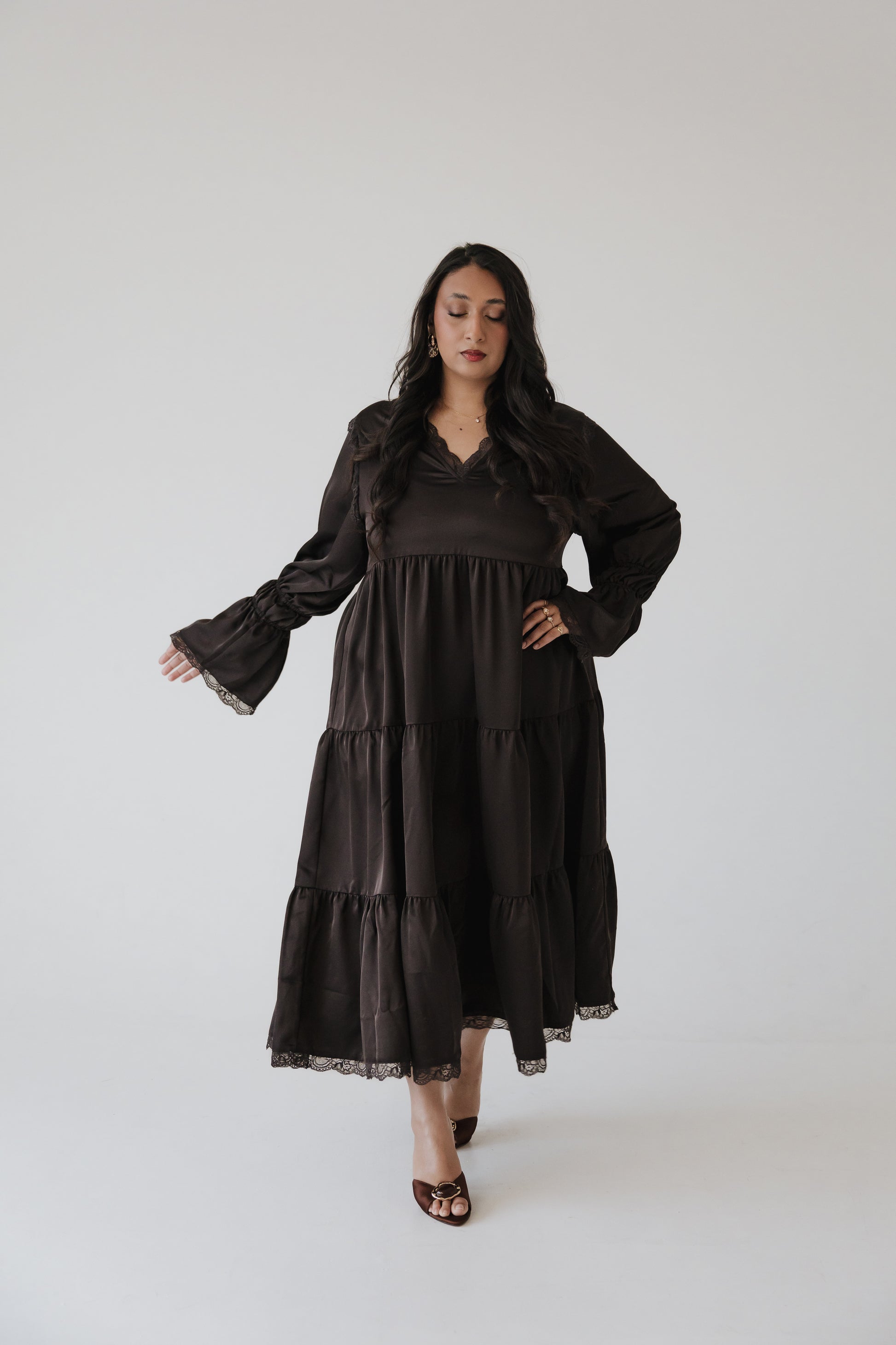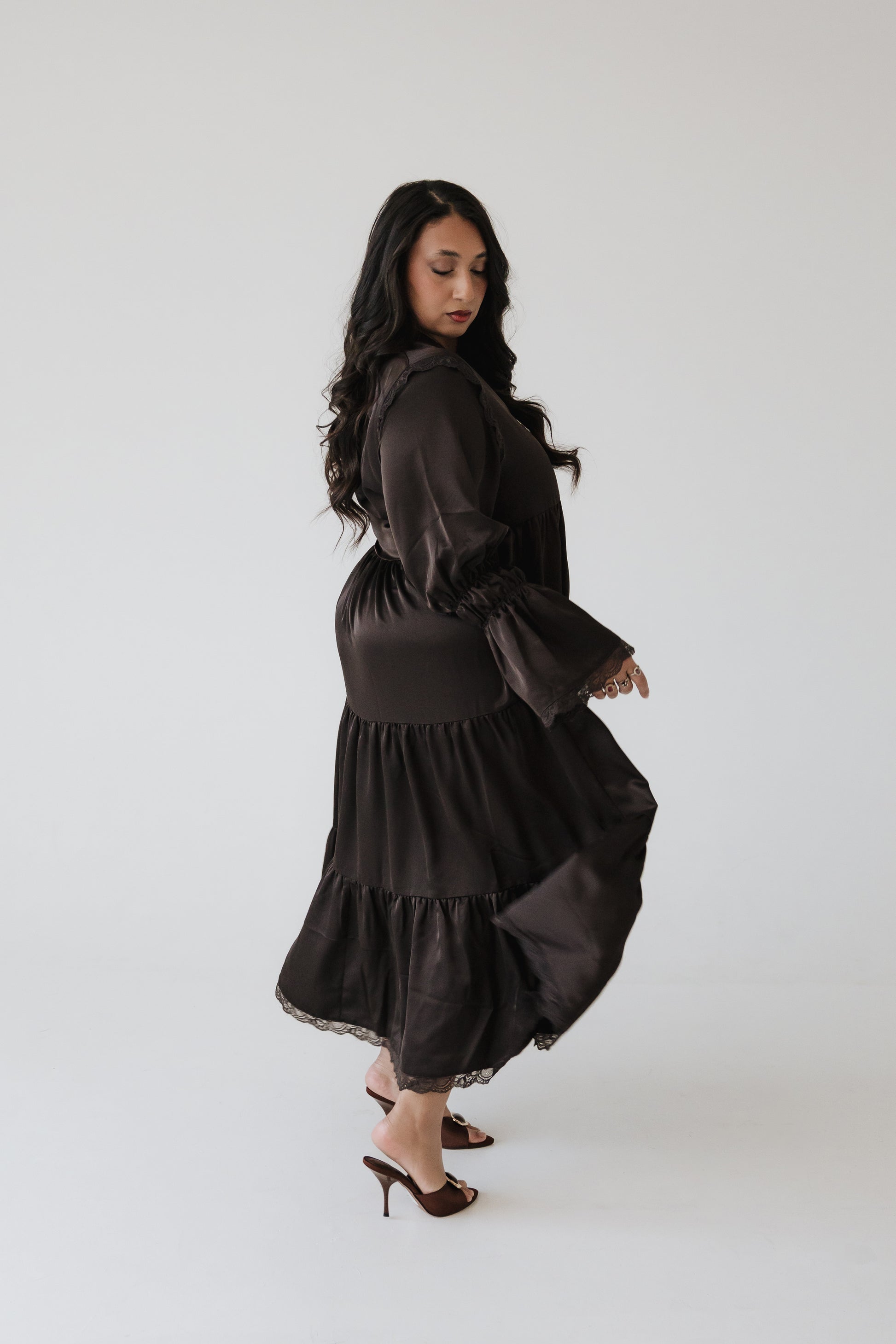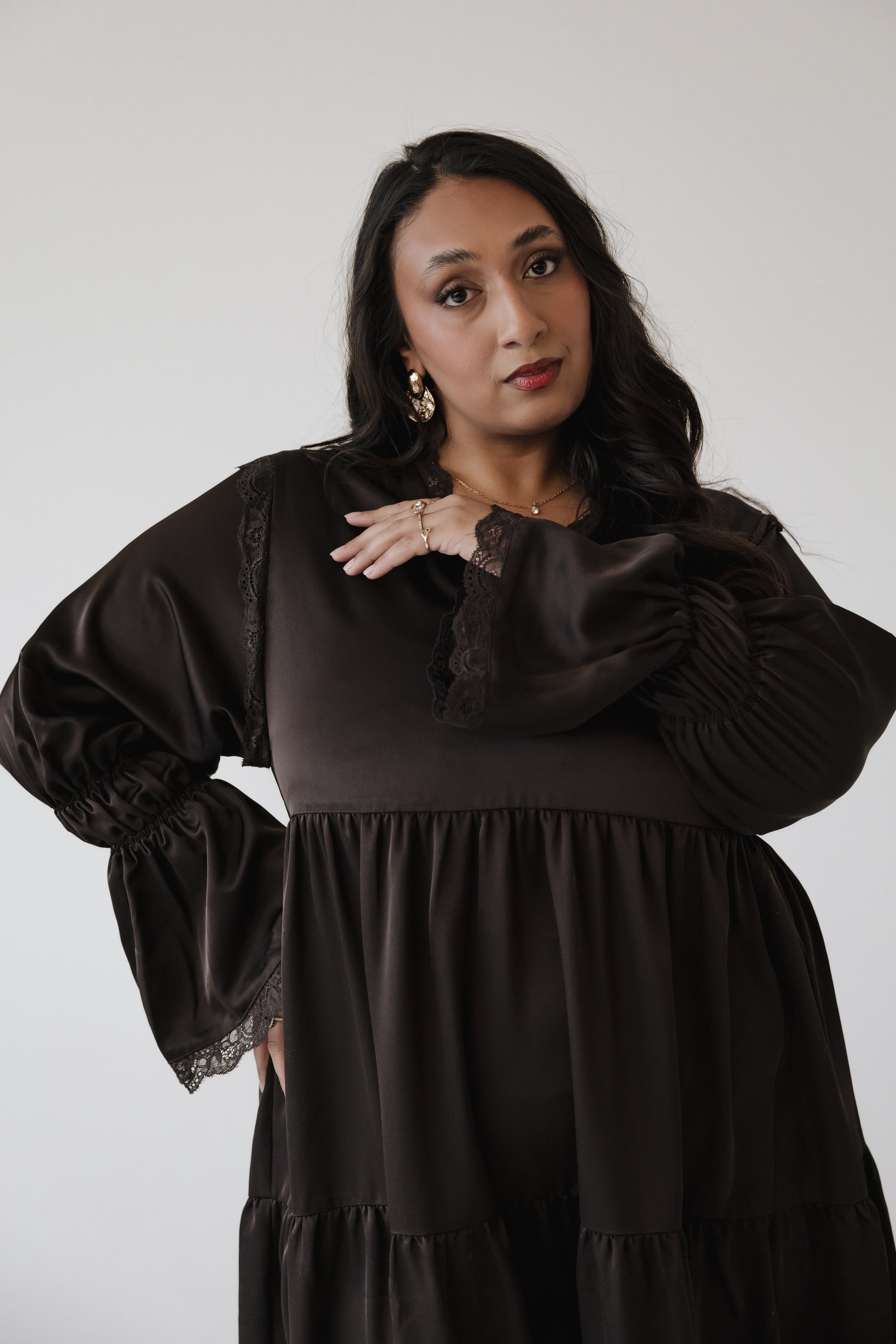 Von er komin aftur í hátíðarbúning! Kjóllinn kemur í dökkbláu og expresso brúnum og er klæðilegur, flæðandi og fallegur. Á öllum endum, öxlum og við hálsmál er falleg vönduð blúnda sem gerir flíkina einstaka. Ermarnar eru útvíðar en dregnar saman með tveimur teygjum aðeins fyrir ofan úlnlið. Von var hönnuð með það að markmiði að búa til tímalausa flík sem hægt er að nota á öllum árstímum og fyrir öll tilefni.